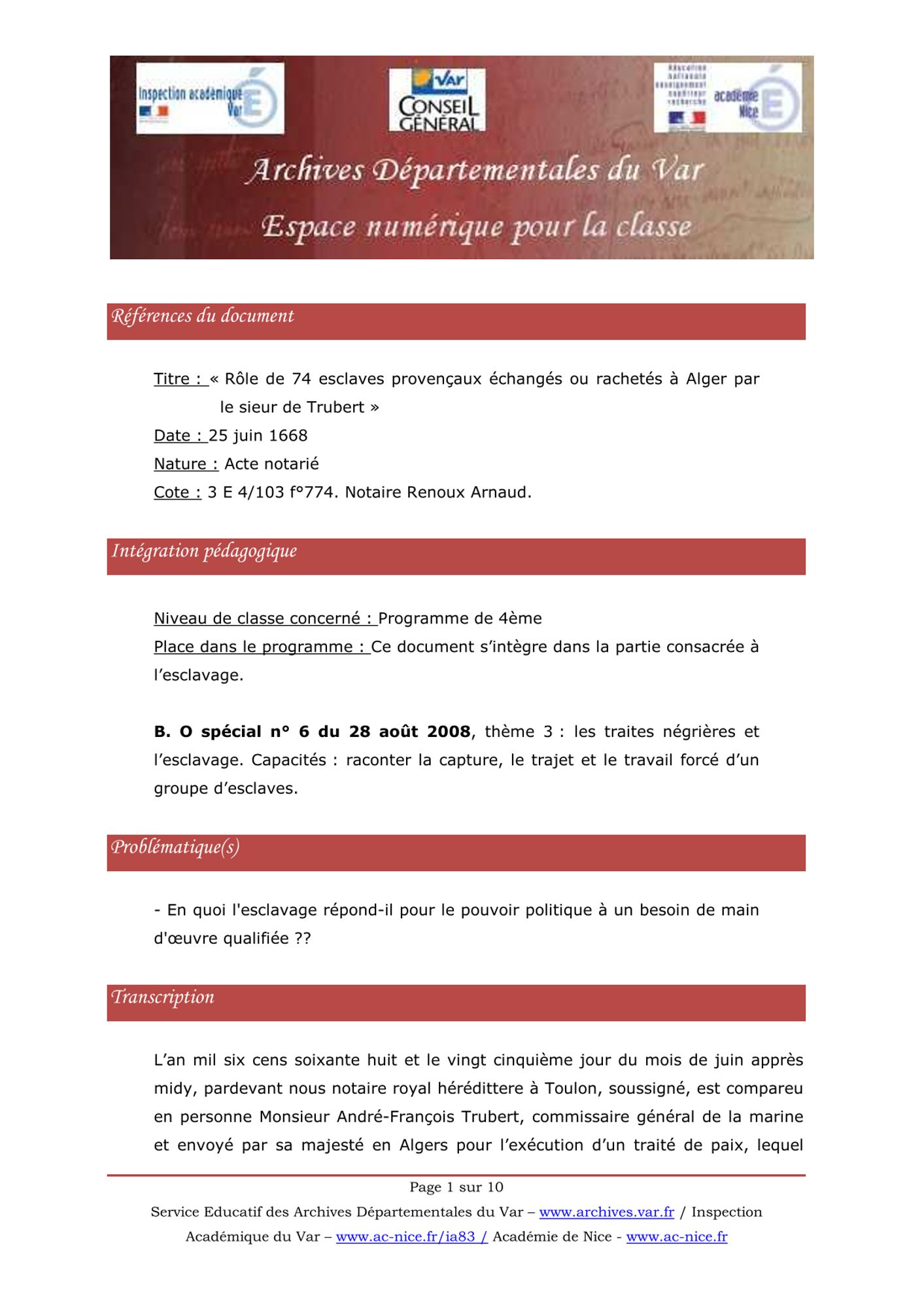 Ce document permet d’évoquer une facette assez méconnue de l’esclavage au XVIIe et XVIIIe siècles, celui de la traite arabe, pendant du commerce triangulaire occidental ainsi que les relations diplomatiques transméditerranéennes pendant le règne de Louis XIV, notamment la guerre que déclare le dey d’Alger à Louis XIV en 1681, soit 25 ans après le traité de paix conclu par le sieur de Trubert.