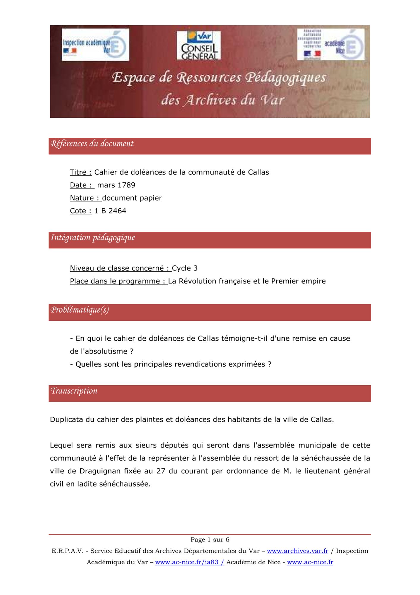 Ce document a été rédigé par les représentants des habitants de la communauté de Callas.