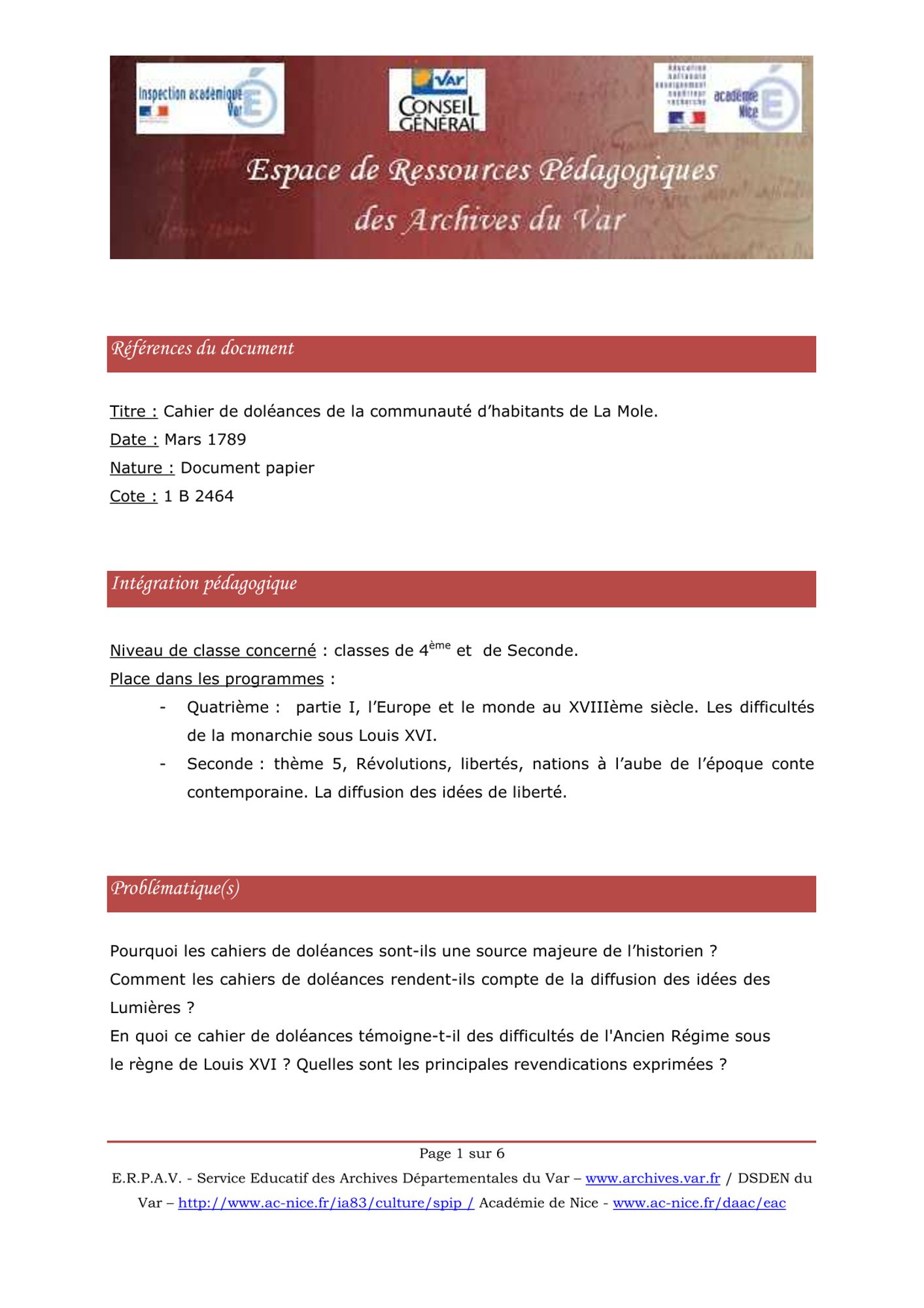 Cahier de doléances de la communauté d'habitants de La Môle