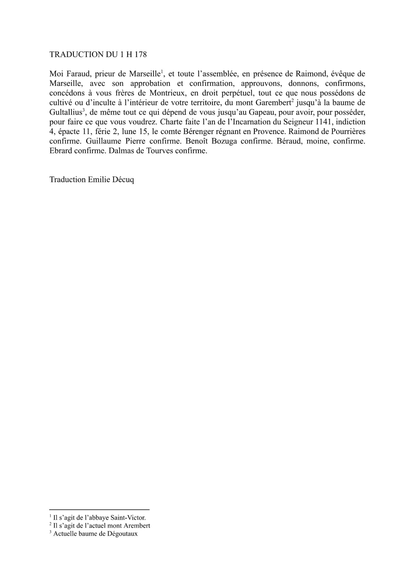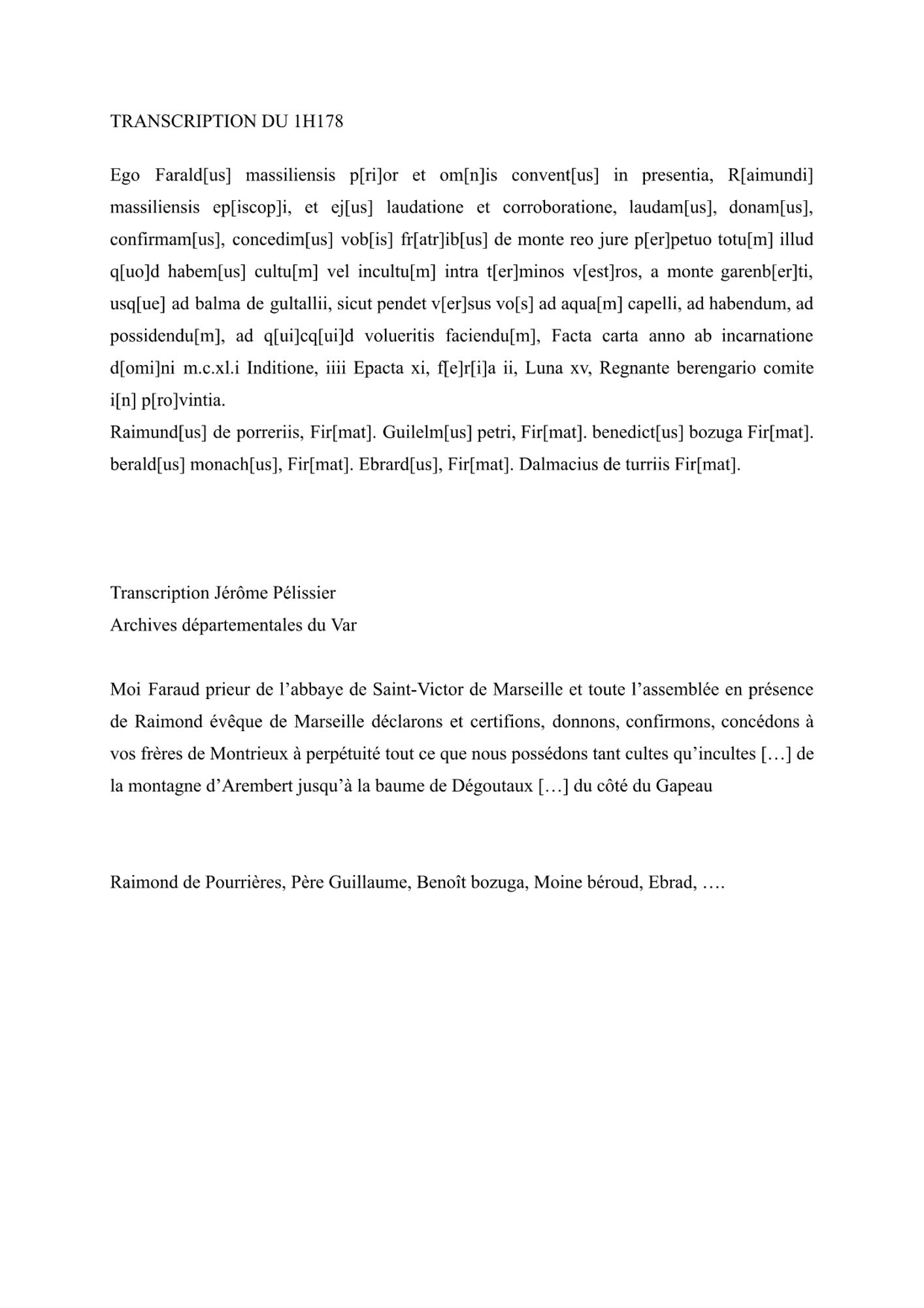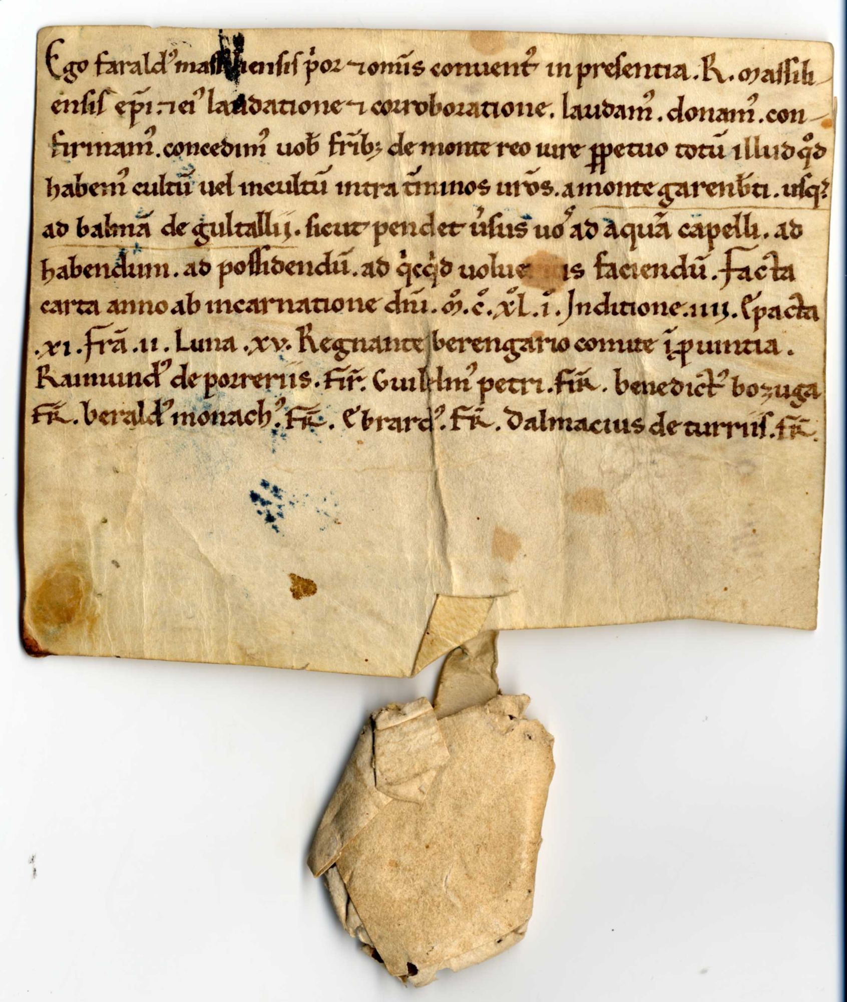 Ce document coté 1 H 178 fait partie d'un esemble de 5 parchemin et un sceau datant de 1141 à 1243. Ce document est une donation de terre au quartier de Gavaudan.