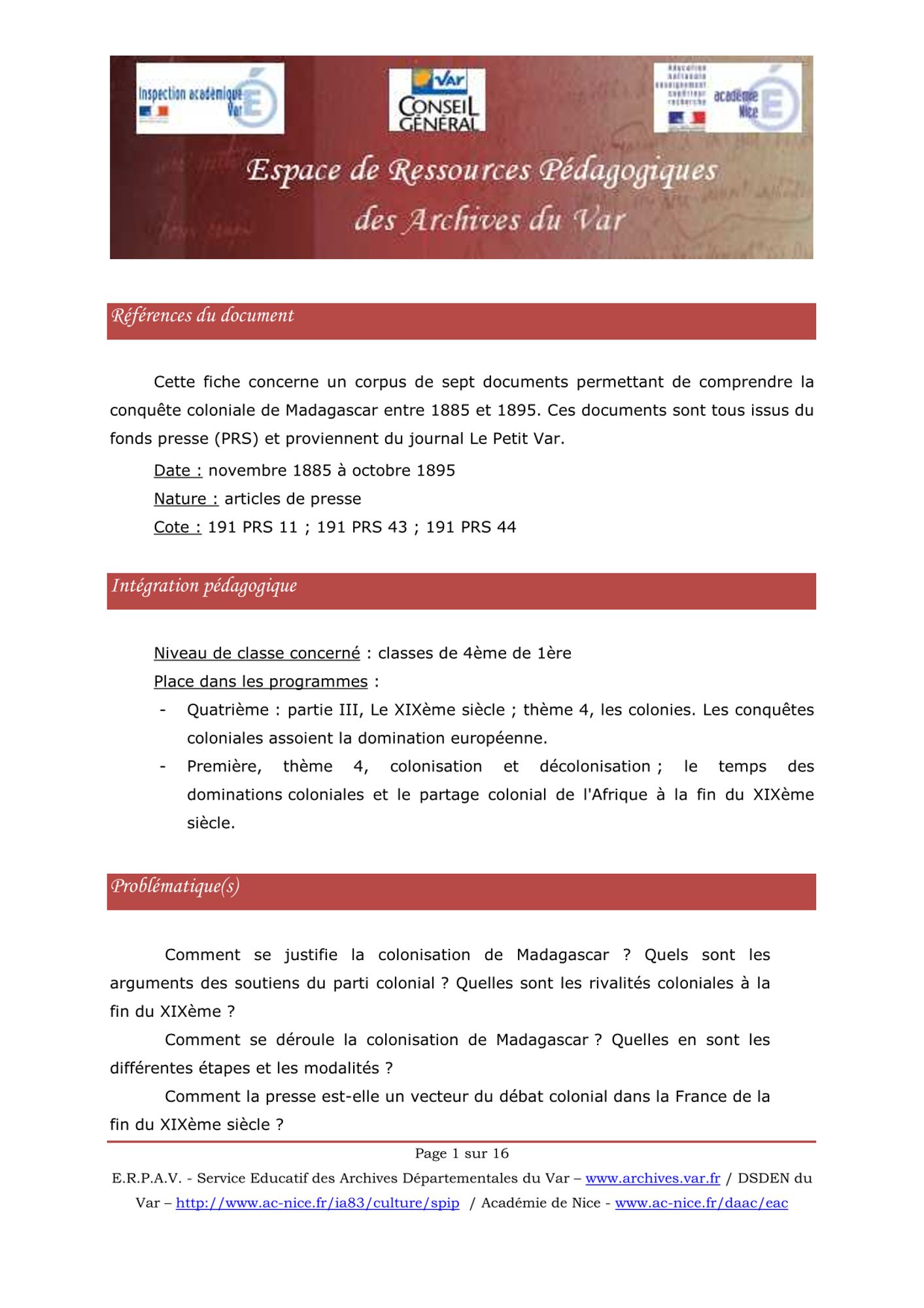 Corpus de sept documents sur la conquête coloniale de Madagascar entre 1885 et 1895 Ces documents sont tous issus du fonds presse (PRS) et proviennent du journal Le Petit Var 1 7 2 7 3 7 4 7 5 7 6 7 7 7 Le corpus présenté ici comprend sept documents issus du fonds Presse (série PRS). Il s’agit de sept publications correspondant soit au courrier des lecteurs soit d’articles de la rédaction du journal. Pistes pédagogiques - Quatrième, Première (273.6 Ko)
