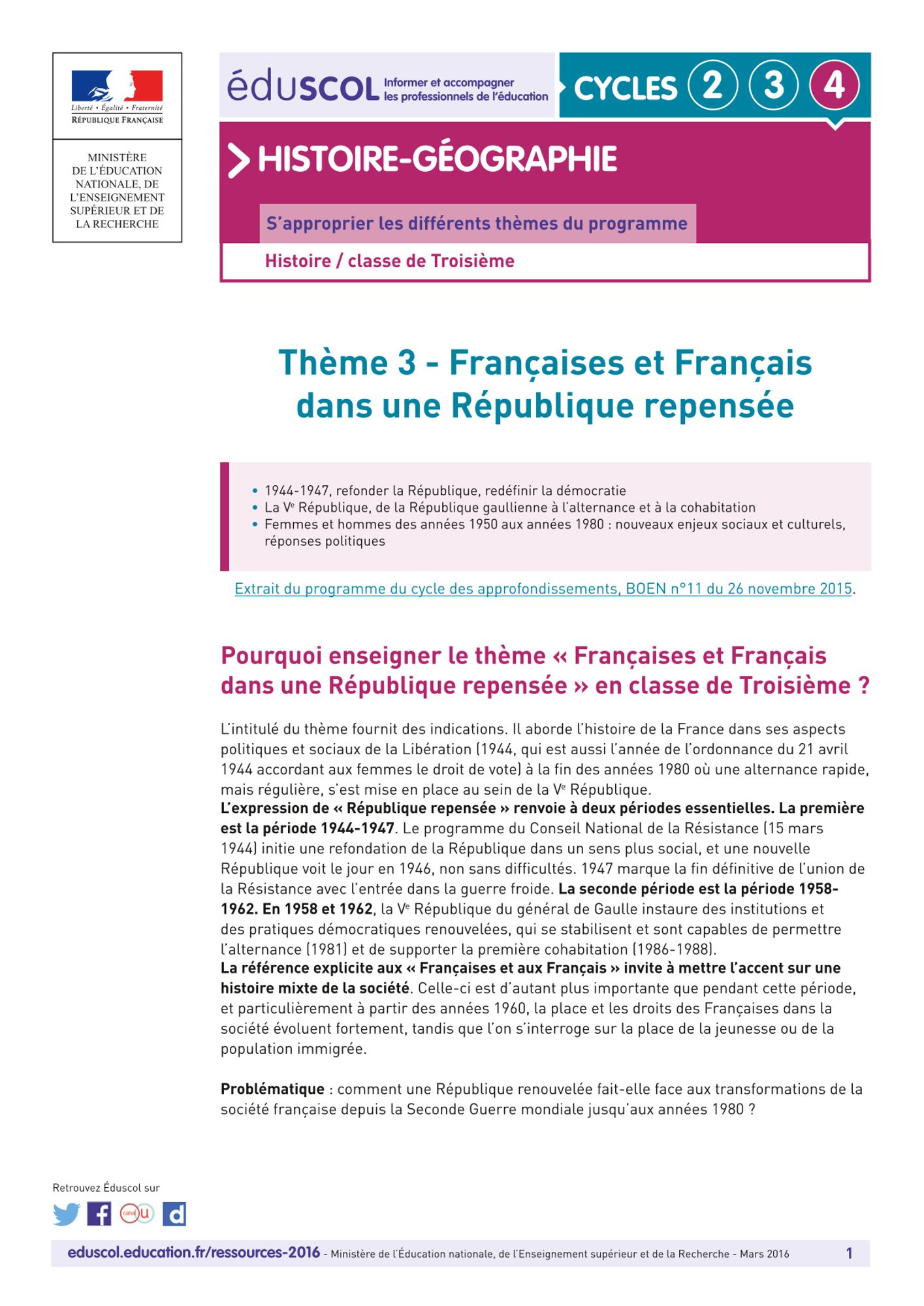 Cette thématique correspond à l’introduction du thème 3 du nouveau programme de cycle IV d'histoire-géographie du collège intitulé “Françaises et Français dans une République repensée”. La référence explicite aux “Françaises et aux Français” dans le programme de l’Education Nationale invite les enseignants à mettre l’accent sur une histoire mixte de la société.