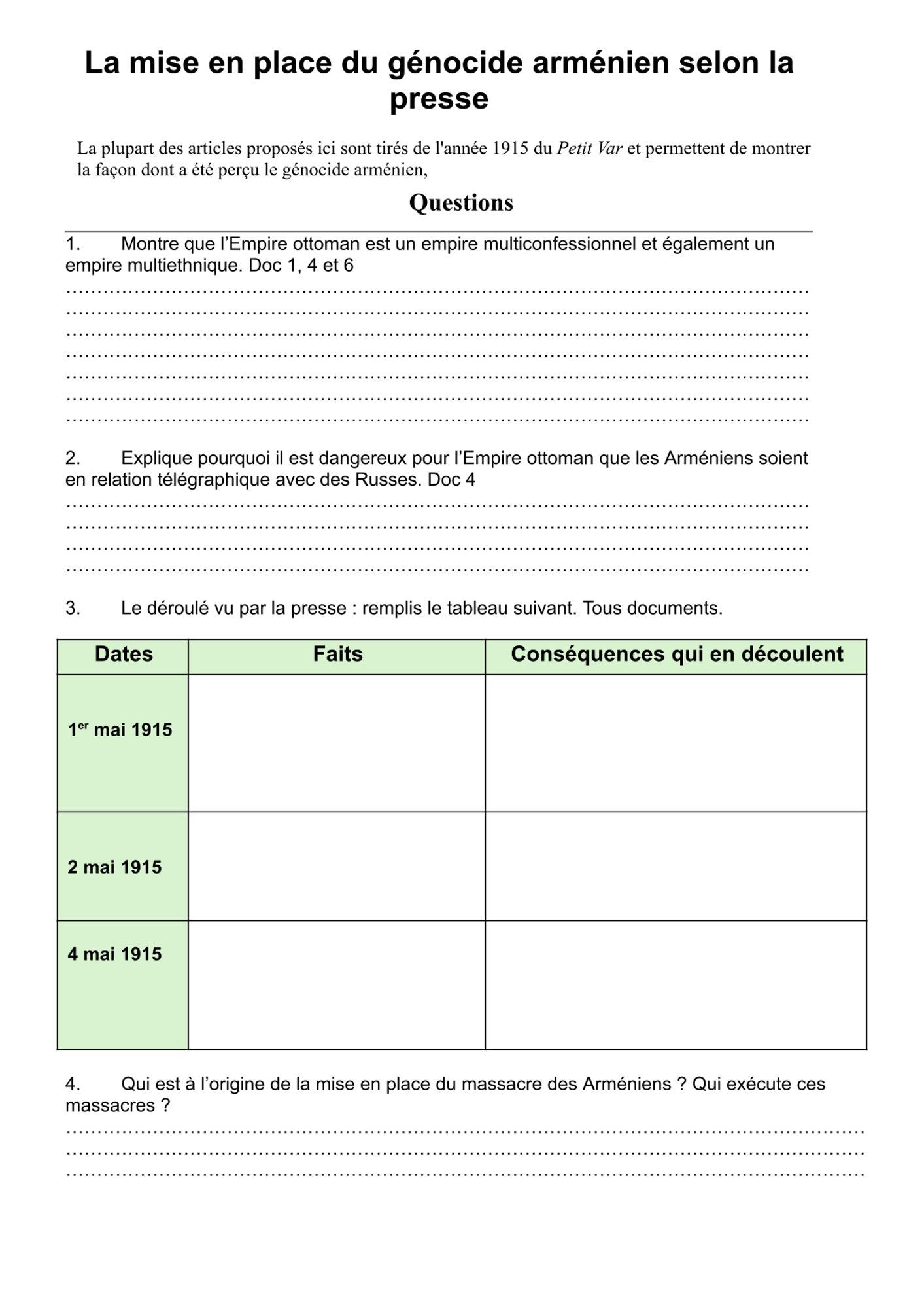 Le génocide arménien à travers la presse varoise Le massacre des Arméniens vu par la Presse - fiche enseignant.docx - Google Docs (1.0 Mo) Le massacre des Arméniens vu par la Presse - fiche élève (921.9 Ko) Fiche pédagogique sur le génocide arménien (879.6 Ko)