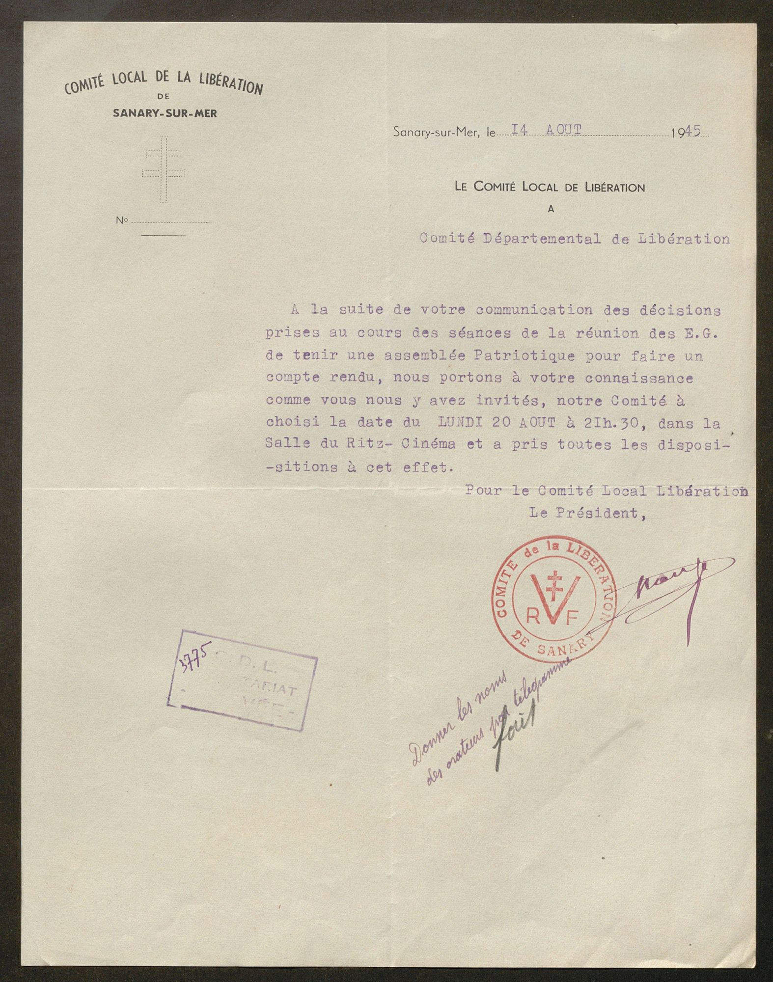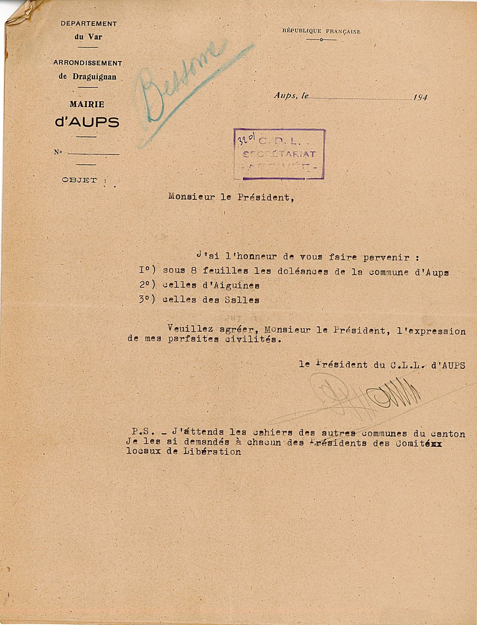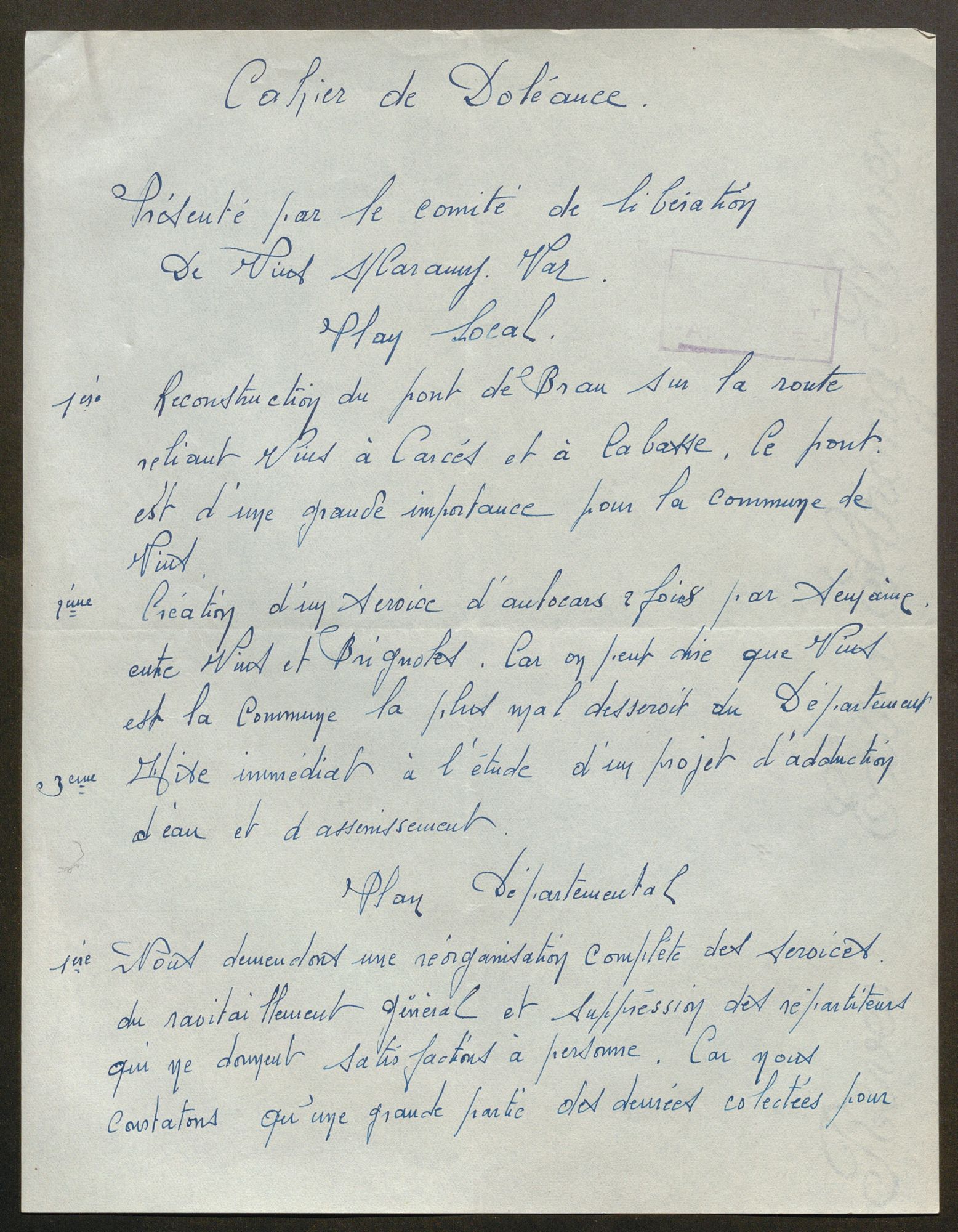 La première vague de textes est suscitée par la convocation par le CNR, à l’Hôtel de Ville de Paris, de « l’assemblée nationale des comités départementaux de la Libération », les 15 et 16 décembre 1944. Le CDL du Var invite, le 10 novembre, les comités locaux de libération (CLL) à se rendre au congrès qui aura lieu à Draguignan les 9 et 10 décembre et qui, entre autres objectifs, désignera trois délégués qui porteront une synthèse des « doléances » locales à Paris. Les CLL doivent donc réunir la population de leur commune pour lui présenter le programme du CNR et rassembler ses vœux. En dépit d’un contexte difficile et d’un délai court, 43 communes au moins fournissent les « cahiers de doléances » demandés. La plupart des assemblées souvent qualifiées de « patriotiques » ou « populaires » se tiennent entre le 6 et 9 décembre. Le CLL de Ginasservis précise que la sienne s’est tenue dans la salle de la mairie à 21 heures le 7. À La Môle, la « réunion patriotique » a rassemblé « la plus grande partie de la population » et, à Collobrières, 500 personnes, « chiffre record obtenu dans notre commune à ce jour », d’après le CLL. À Ramatuelle, le cahier est signé par plus de 80 personnes le 8 décembre. Au total, plus de 80 « cahiers » – en fait des feuillets de une à trois pages – ont été transmis au CDL.