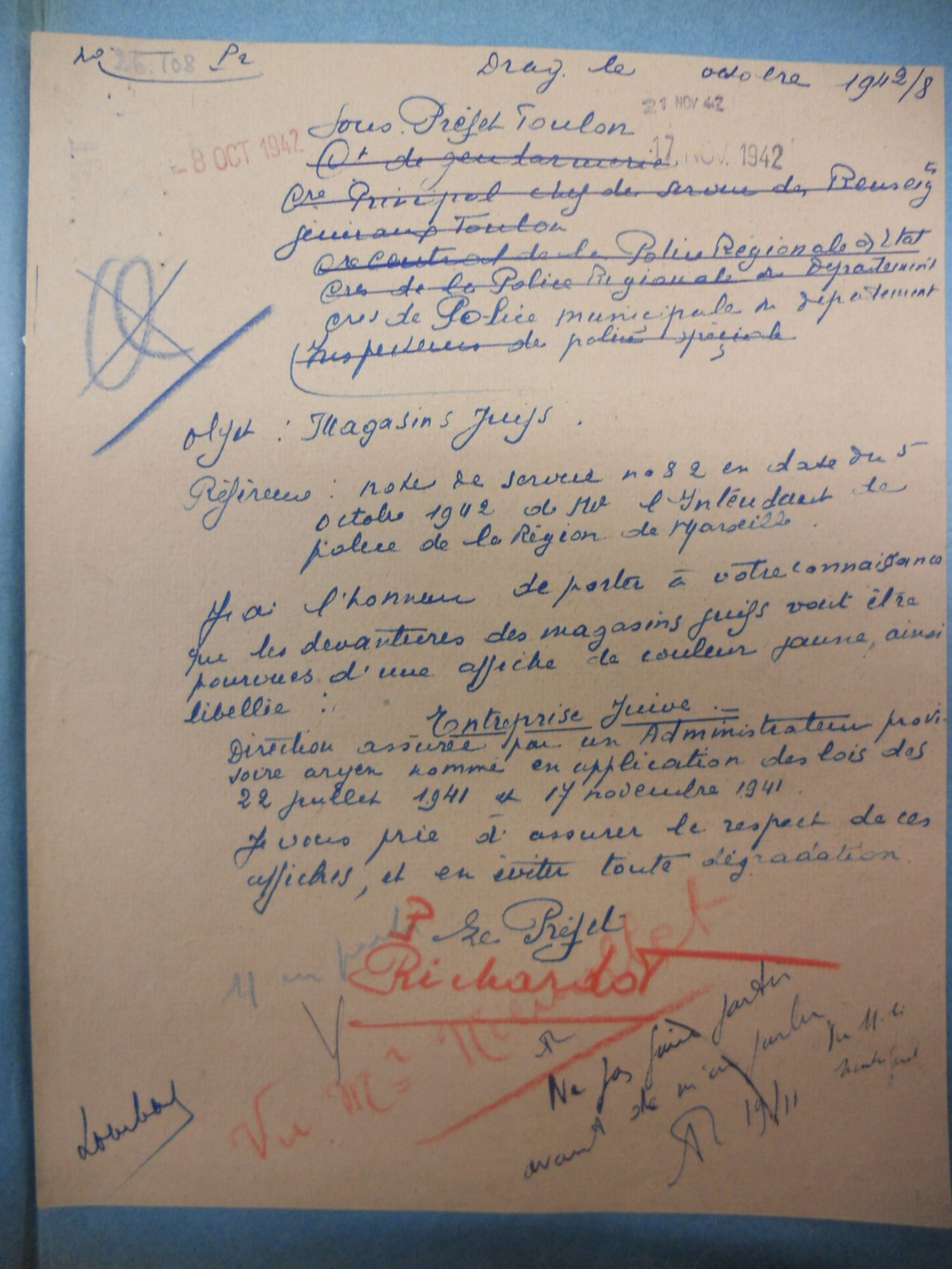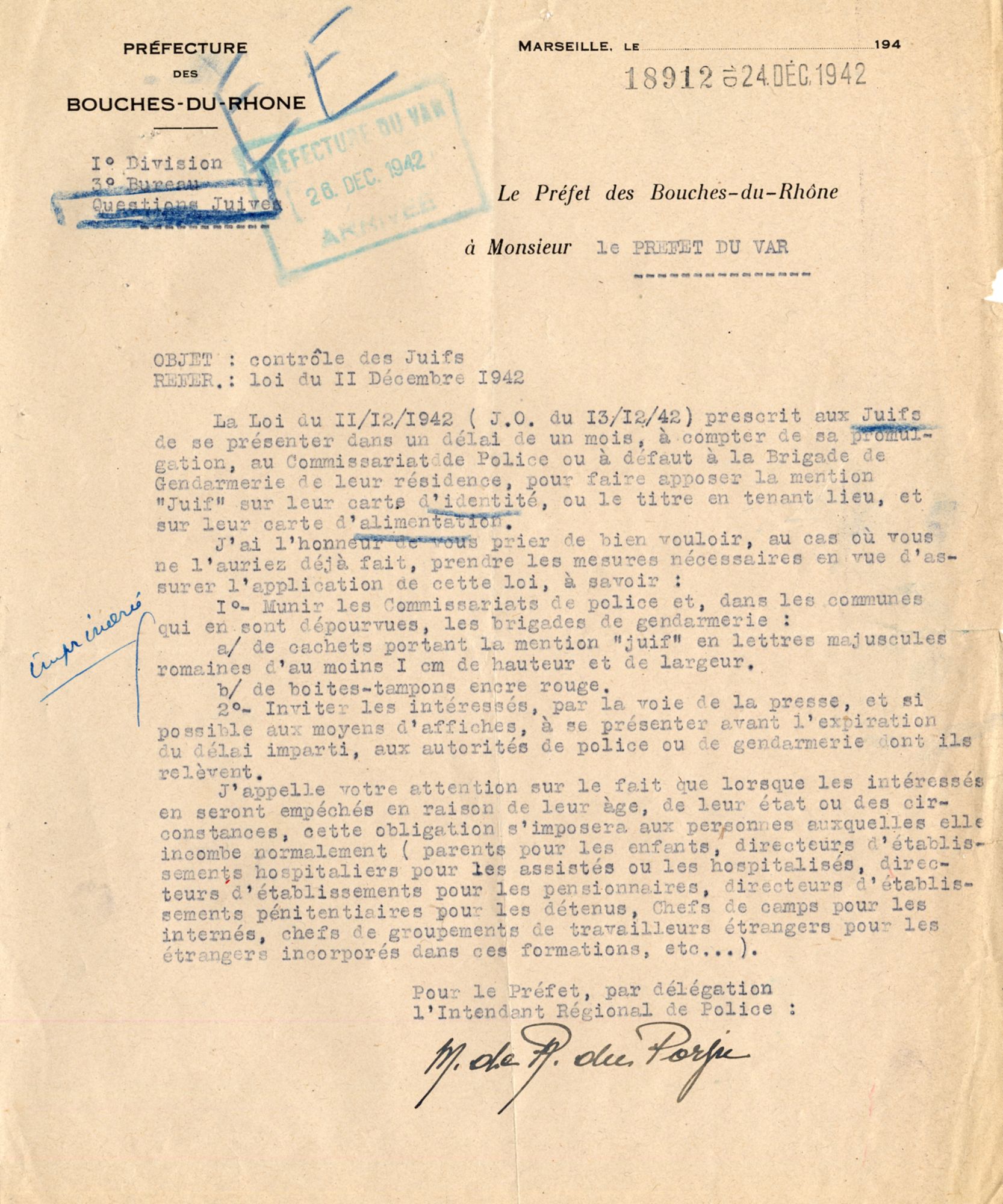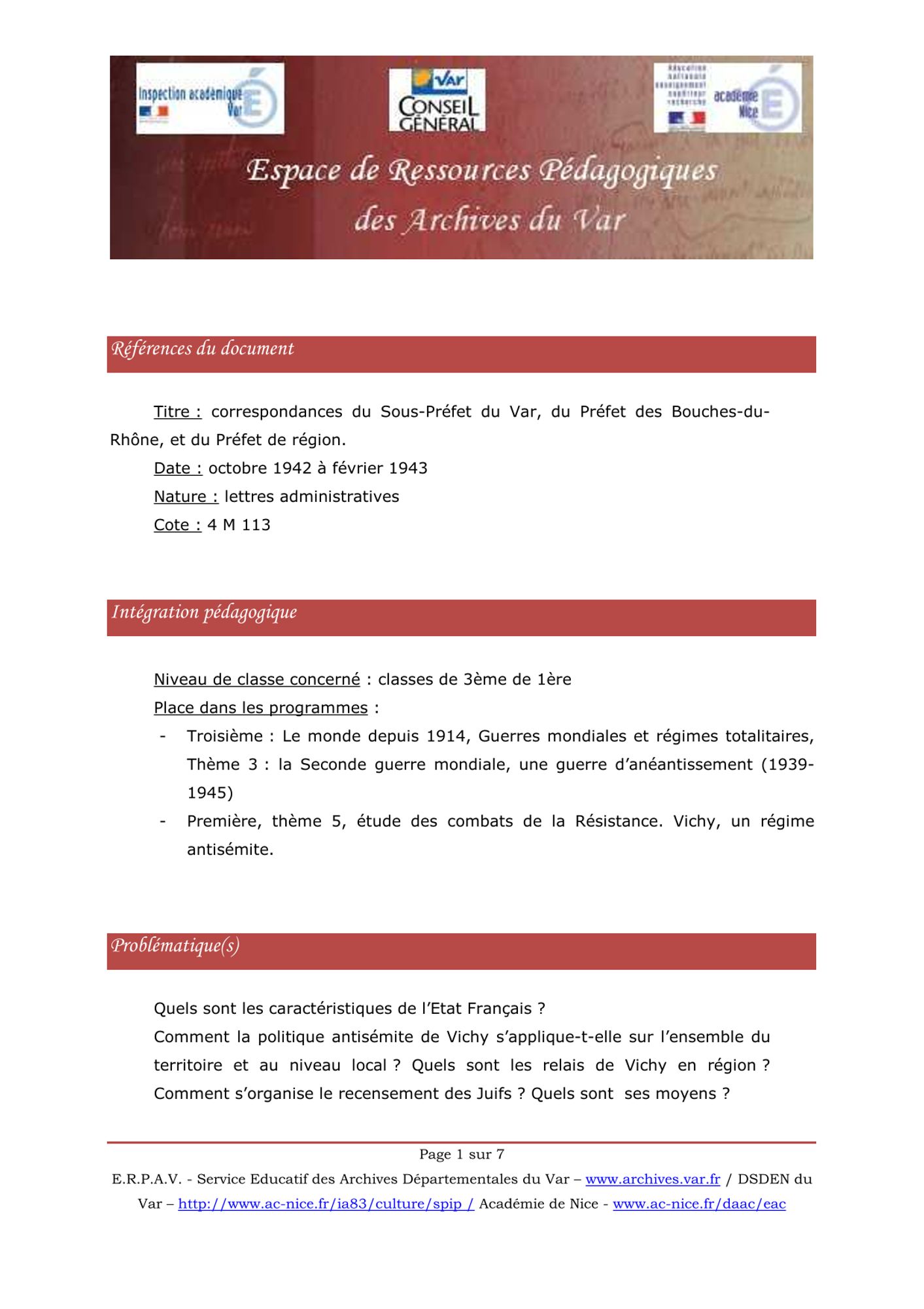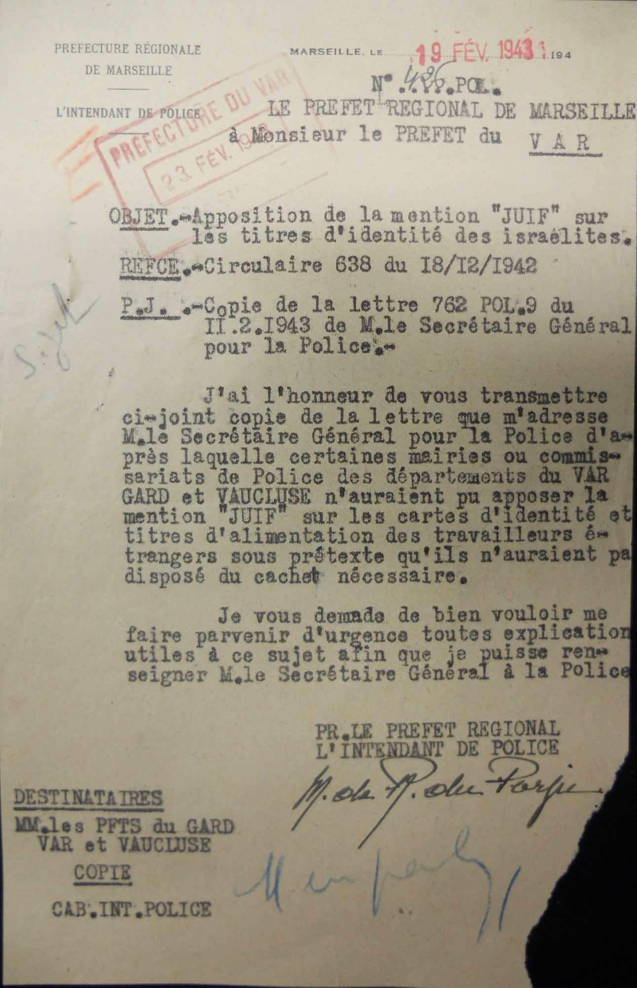 Correspondance du Sous-Préfet du Var, du Préfet des Bouches-du-Rhône, et du Préfet de région au sujet de la mise en place de la politique antijuive de Vichy. fiche_peda_poantijuives.pdf (103.7 Ko)