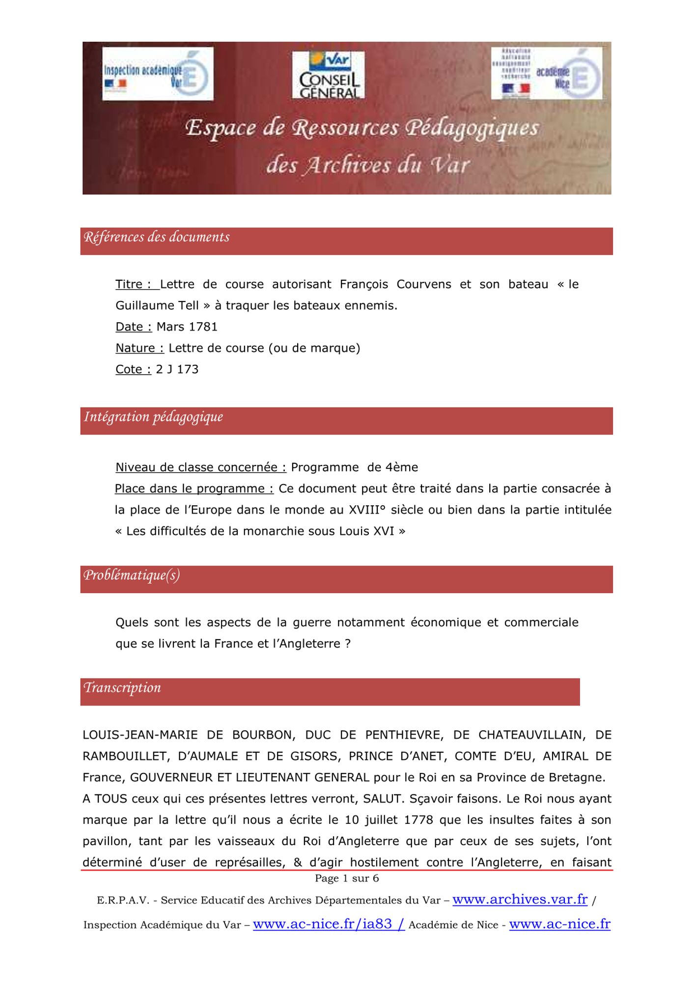 Ce document permet de travailler sur le rôle de la lettre de course et des corsaires et notamment leur rôle dans la guerre économique que se livrent français et anglais dans cette fin du XVIII° siècle.