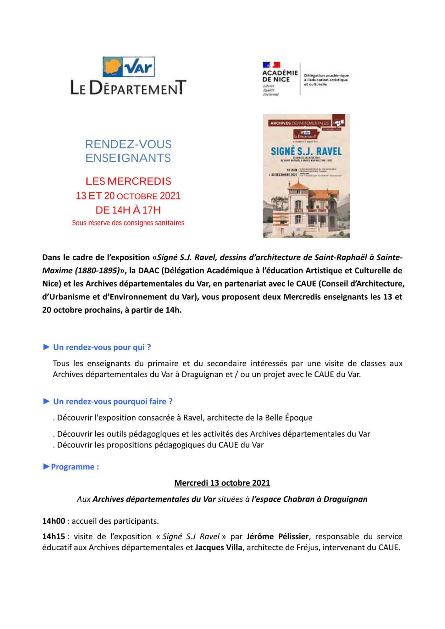 Dans le cadre de l’exposition «Signé S.J. Ravel, dessins d’architecture de Saint-Raphaël à Sainte-Maxime (1880-1895)», la DAAC (Délégation Académique à l’éducation Artistique et Culturelle de Nice) et les Archives départementales du Var en partenariat avec le CAUE (Conseil d’Architecture, d’Urbanisme et d’Environnement du Var), vous proposent deux Mercredis enseignants les 13 et 20 octobre prochains, à partir de 14h.