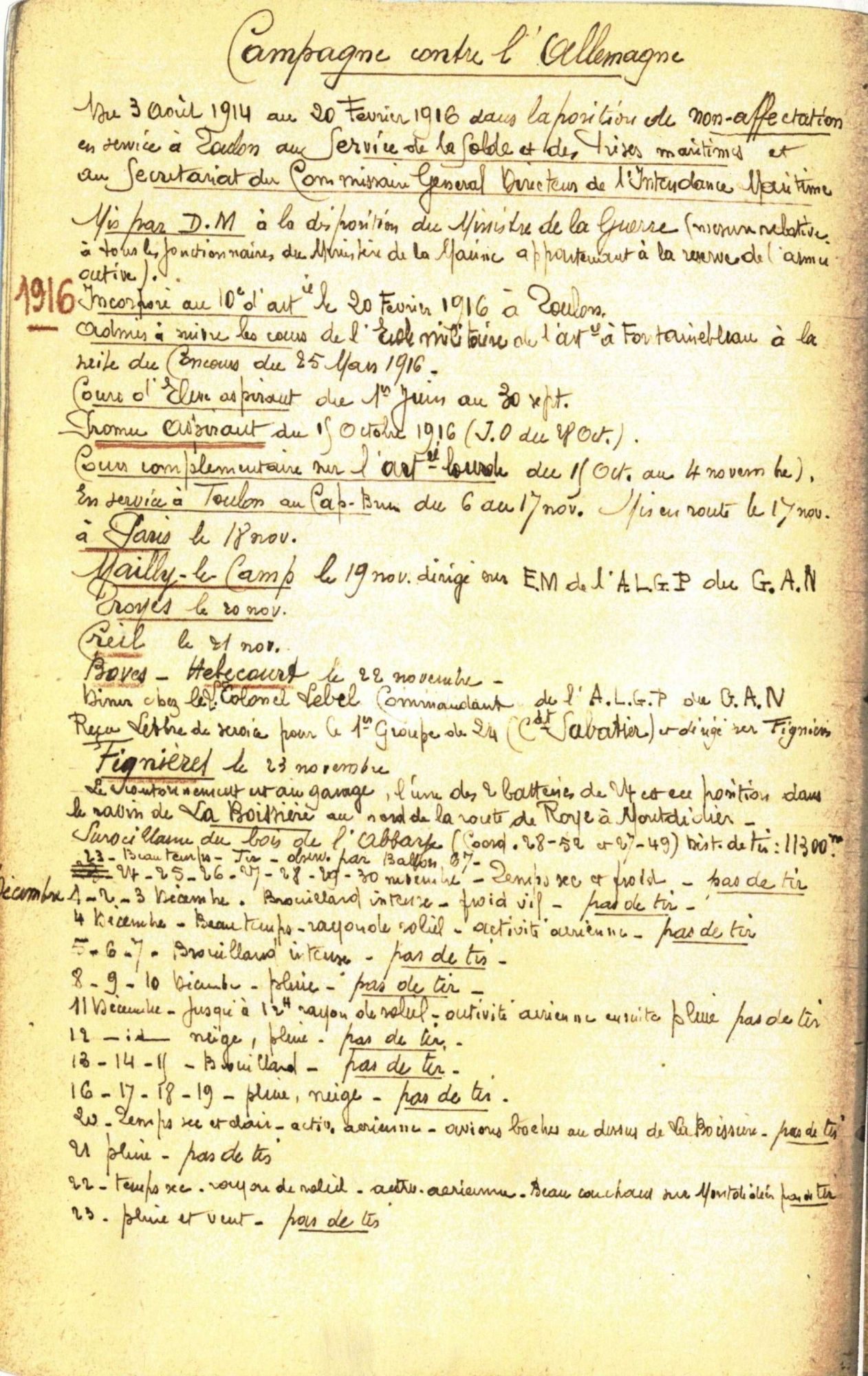 - Aspirant d'artillerie à partir du 15 octobre. Cours complémentaire sur l'artillerie lourde du 15 octobre au 3 novembre 1916.