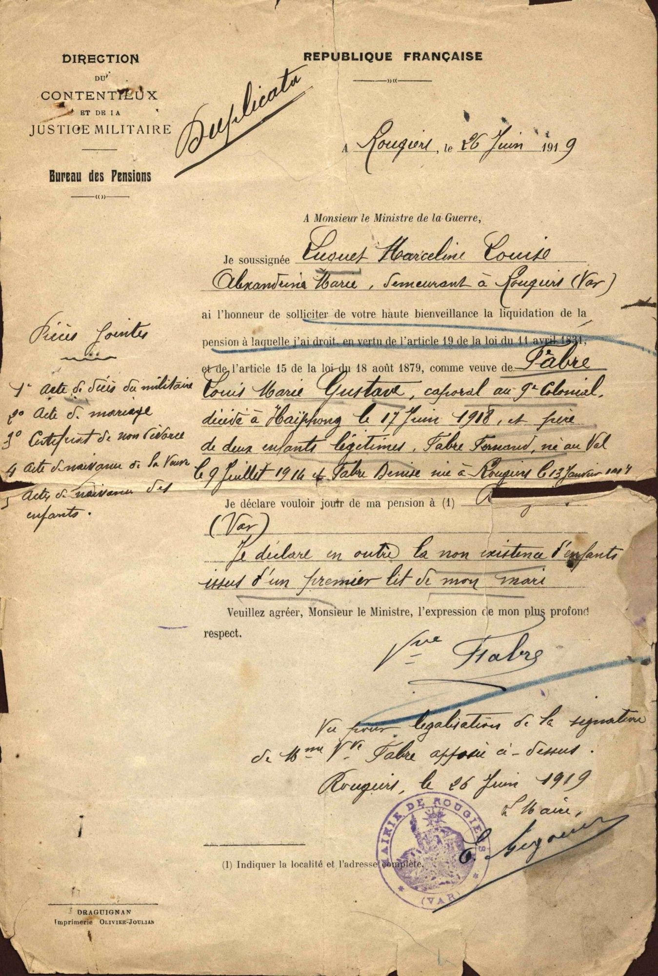 Dossier de veuve de guerre de Marceline Fabre, veuve de Gustave Fabre Dossier de veuve de guerre de Marceline Fabre, veuve de Gustave Fabre 27