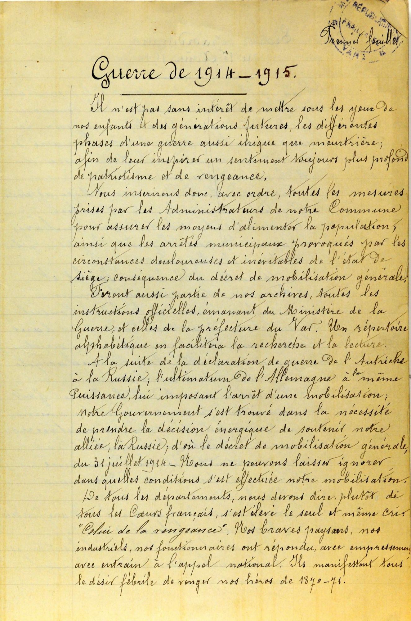 Rédigé certainement par le secrétaire de Mairie, ce journal a pour but de "mettre sous les yeux de nos enfants et des générations futures, les différentes phases d'une guerre aussi inique que meurtrière ; afin de leur inspirer un sentiment toujours plus profond de patriotisme et de vengeance. Nous insérerons donc, avec ordre, toutes les mesures prises par les Administrateurs de notre commune pour assurer les moyens d'alimenter la population ; ainsi que les arrêtés municipaux provoqués par les circonstances douloureuses et inévitables de l'état de siège ; conséquence du décret de mobilisation générale.