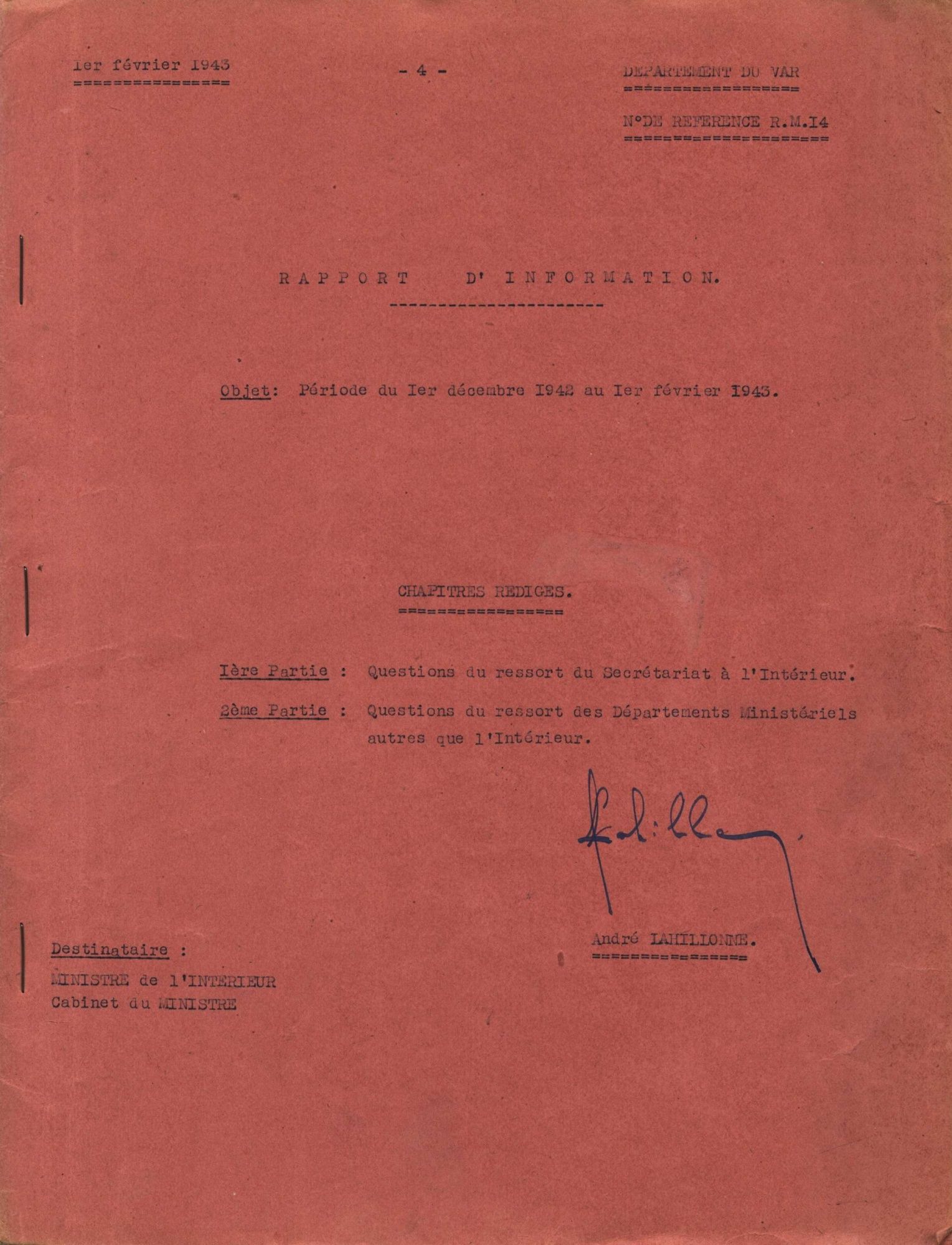 Rapport du préfet du Var au ministre de l'Intérieur sur la situation morale du département du Var pour la période du 1er décembre 1942 au 1er février 1943 Rapport du préfet du Var au ministre de l'Intérieur sur la situation morale du département du Var pour la période du 1er décembre 1942 au 1er février 1943 35