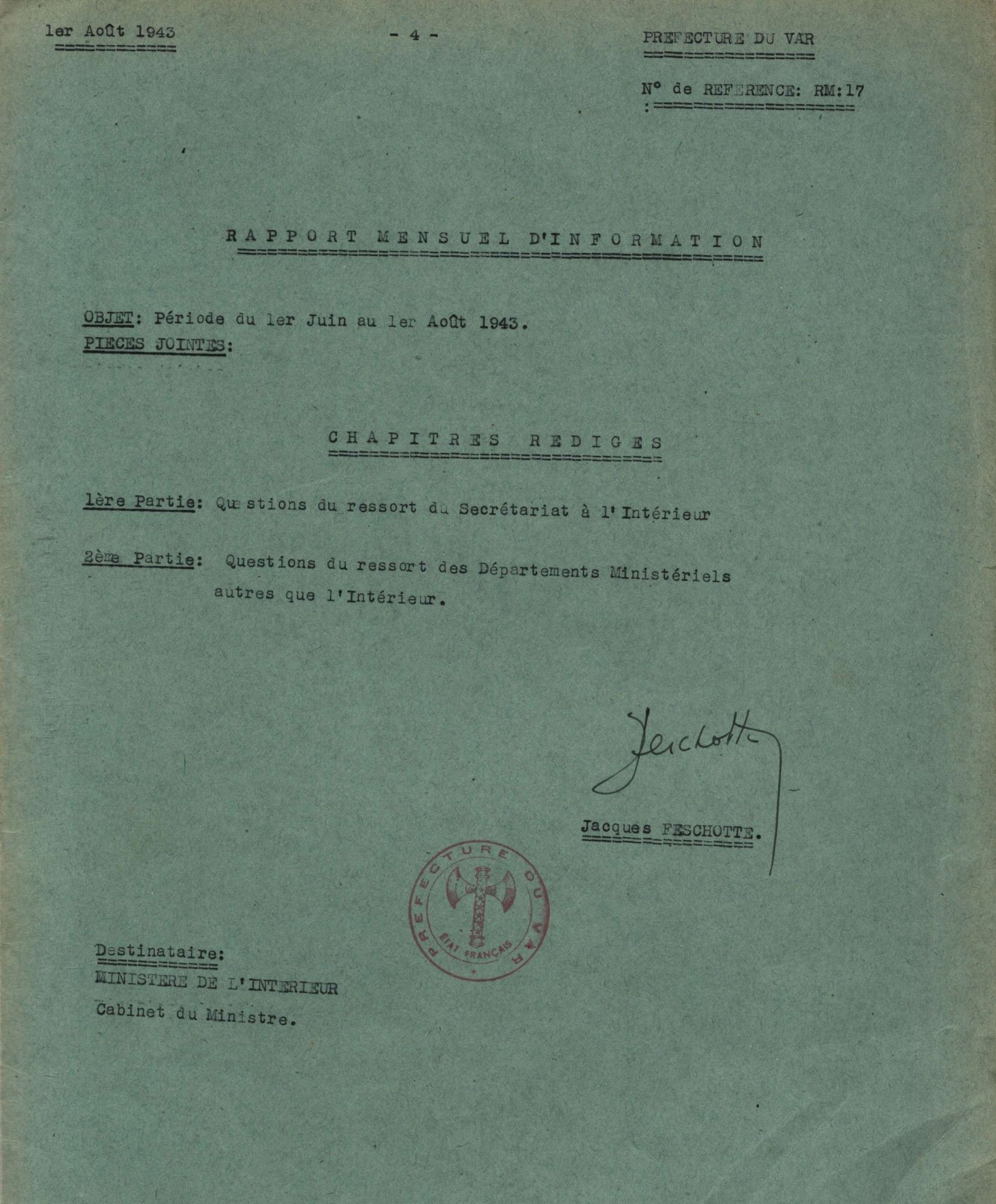Rapport du préfet du Var au ministre de l'Intérieur sur la situation morale du département du Var pour la période du 1er juin 1943 au 1er août 1943 Rapport du préfet du Var au ministre de l'Intérieur sur la situation morale du département du Var pour la période du 1er juin 1943 au 1er août 1943 29