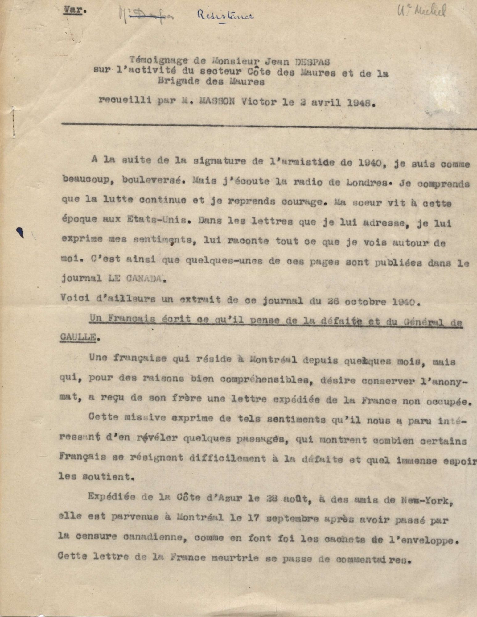 Témoignage du résistant Jean Despas, qui forme le groupement des résistants "Les sans culottes", recueilli par Victor Masson en 1944 Témoignage du résistant Jean Despas, qui forme le groupement des résistants "Les sans culottes", recueilli par Victor Masson en 1944 18