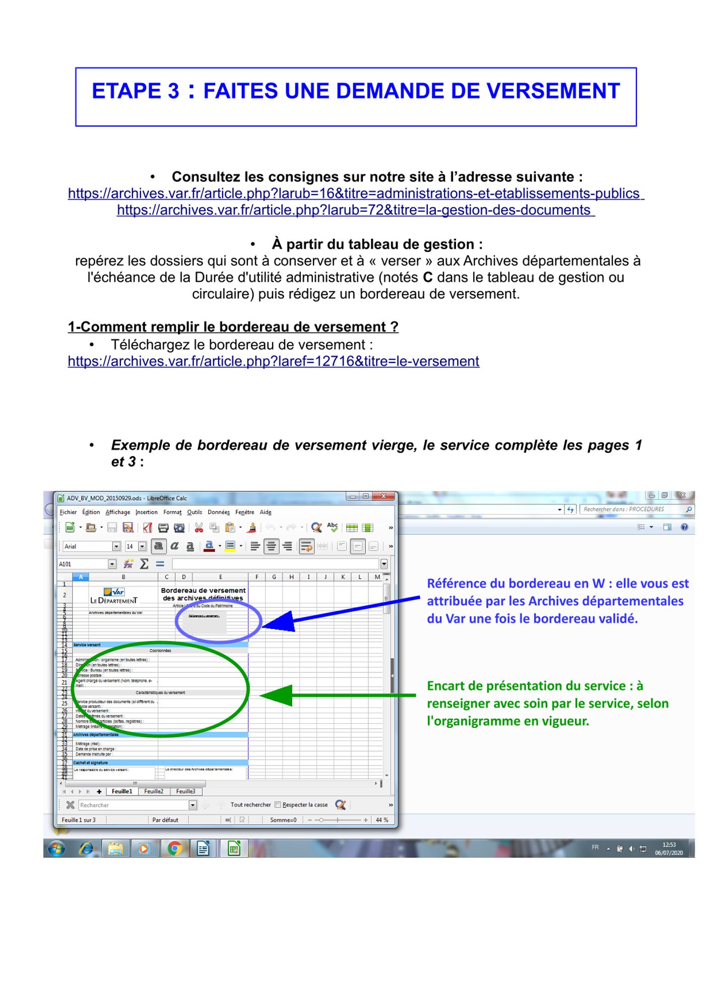 Le service versant enregistre ces informations dans l'onglet 2 du bordereau de versement sous la rubrique "volet amiante". Ce volet est à remplir et à signer obligatoirement par le responsable du service versant qui atteste la conformité des informations du volet amiante. En cas de doute sur l’état sanitaire des archives à verser, contactez votre référent-archives (rubrique Nous contacter) au sein des Archives départementales qui est à votre disposition pour étudier avec vous les mesures à prendre.