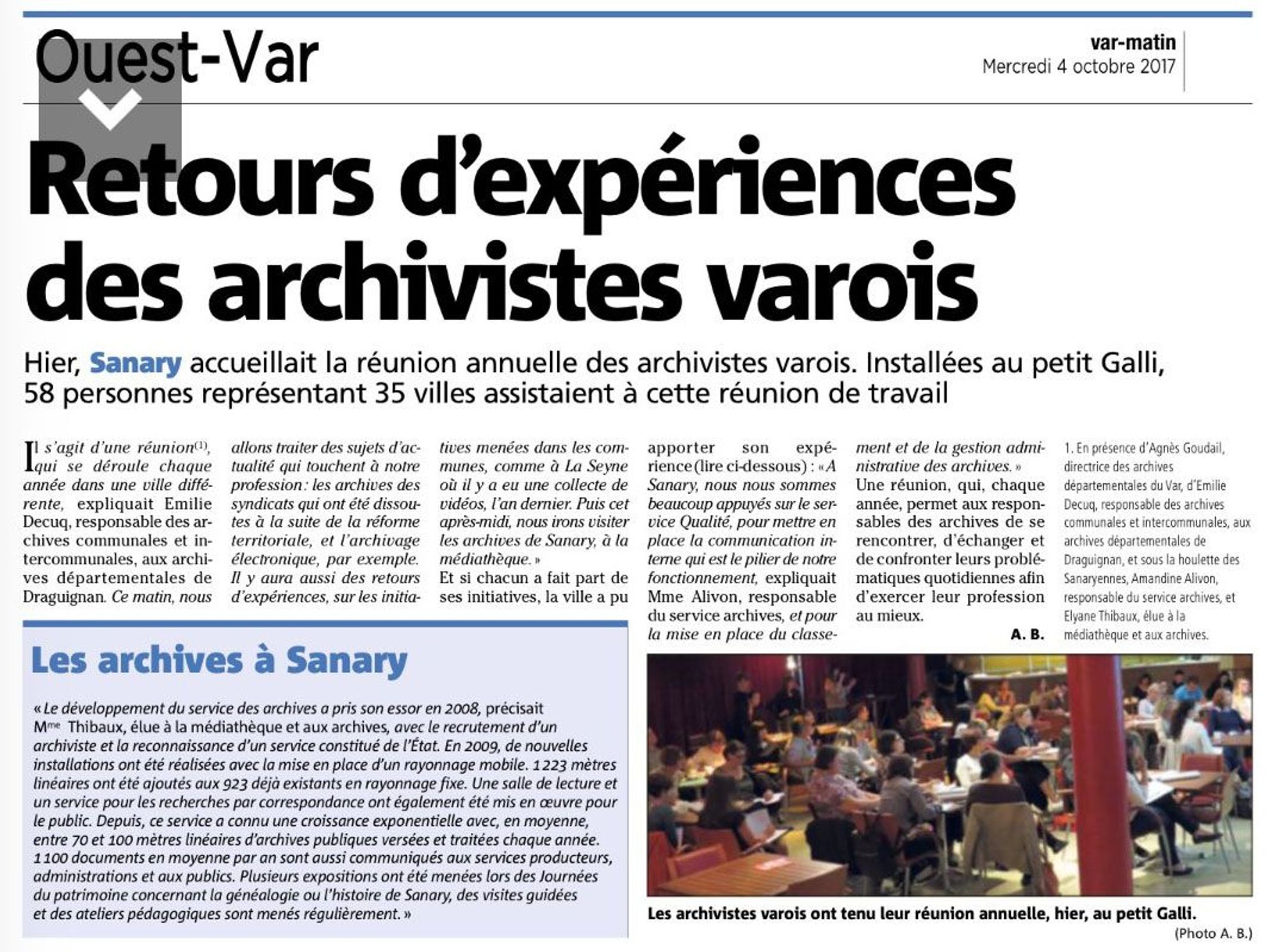 Le 3 octobre 2017, la commune de Sanary-sur-Mer a accueilli la réunion annuelle des archivistes communaux et intercommunaux du Var. Depuis 2008, cette commune s'est attachée à développer un service dédié aux archives en recrutant un agent qualifié, puis en aménageant des locaux aux normes. La cinquantaine de participants a pu échanger sur différentes thématiques (archivage électronique, dévolution des archives des syndicats dissous, etc.), partager des retours d'expérience (collecte de films, formation) et découvrir le travail effectué par l'archiviste de Sanary.