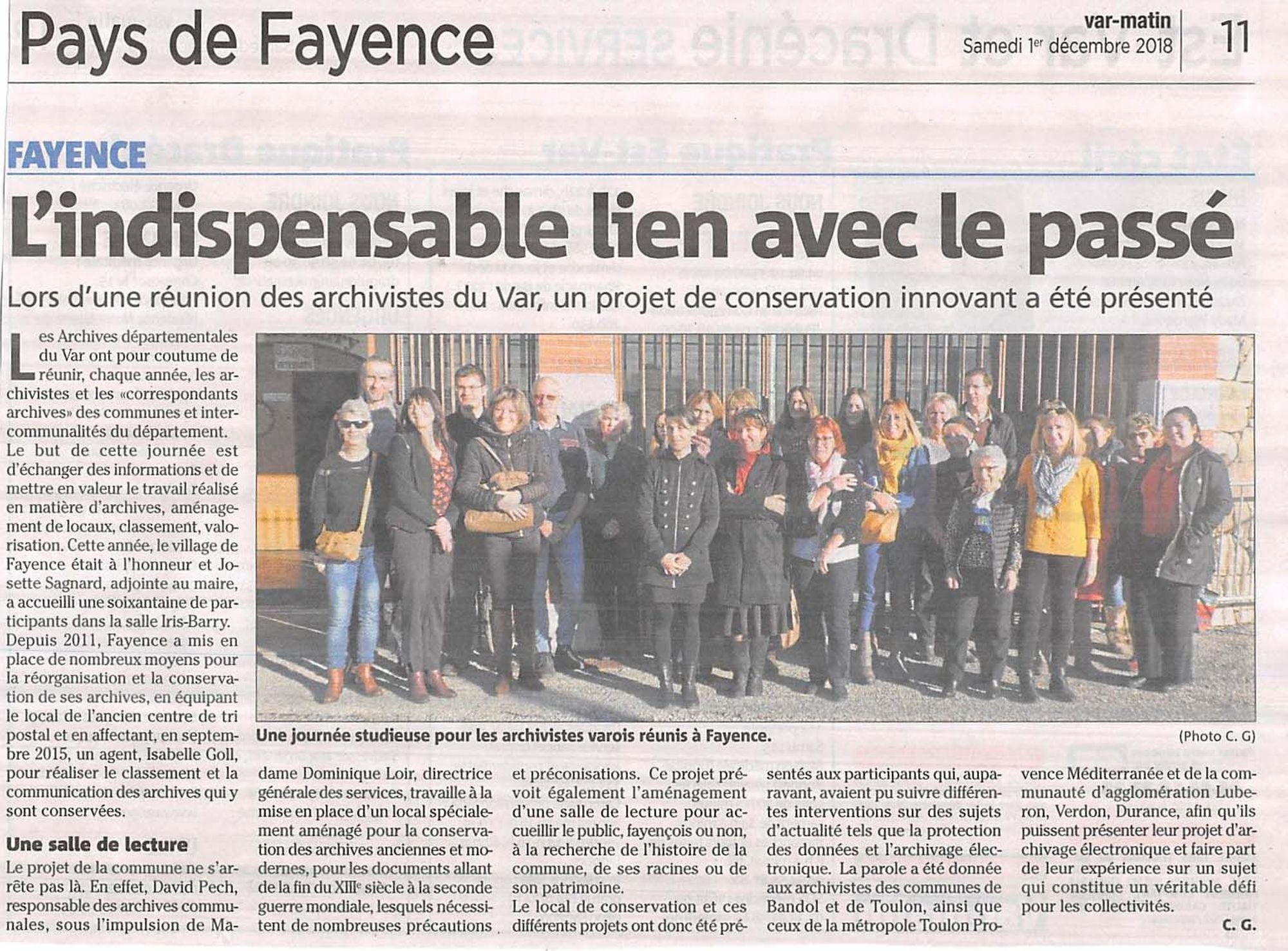 La commune de Fayence a accueilli le 27 novembre 2018 la réunion annuelle des archivistes communaux et intercommunaux du Var. La cinquantaine de participants a pu échanger sur des sujets d'actualité tels que le règlement général sur la protection des données et l'archivage électronique avant de découvrir le travail de réorganisation et de conservation des archives entrepris depuis 2010 par la commune.