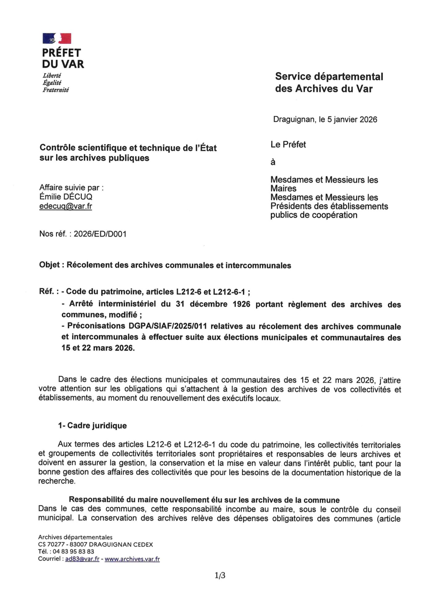 Le procès-verbal de récolement devra être signé par le maire (ou le président de l’E.PC.I.), un exemplaire sera transmis au directeur des Archives départementales du Var.