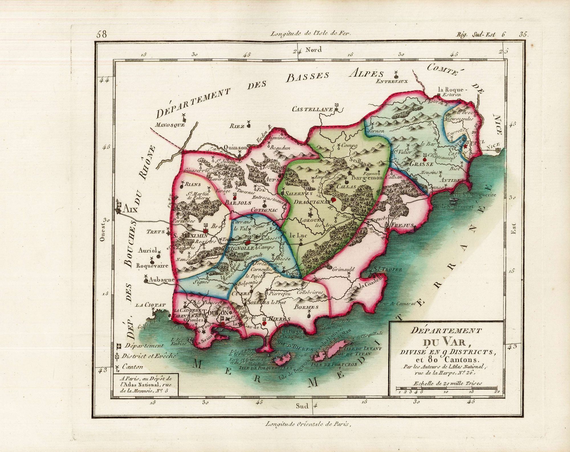 Toulon fut alors désignée comme chef-lieu. Les districts sont aquarellés de quatre couleurs, les chefs-lieux de district sont signalés par un point rouge. L’échelle est de 20 000 toises.