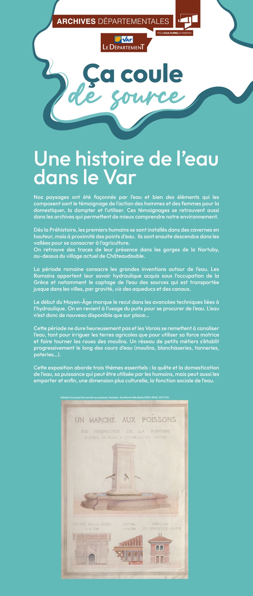 Exposition inaugurale des nouveaux locaux des Archives départementales, en 2015, ça coule de source aborde l'eau en tant que ressource, loisir ou encore risque. A travers des archives de tout le département du Var, provenant de diverses sources : archives communales, iconographiques, ponts et chaussées, etc, on retrouve ce qui fait l'attrait de notre territoire comme lieu de résidence ou de vacances. Avant la seconde moitié du XXe siècle et la généralisation de l'eau courante comme de l'assainissement, la domestication de cette ressource jalonne les villages d'ouvrages d'art et d'architecture : aqueducs, barrages, canaux, fontaines, moulins, majoritairement toujours visibles aujourd'hui.