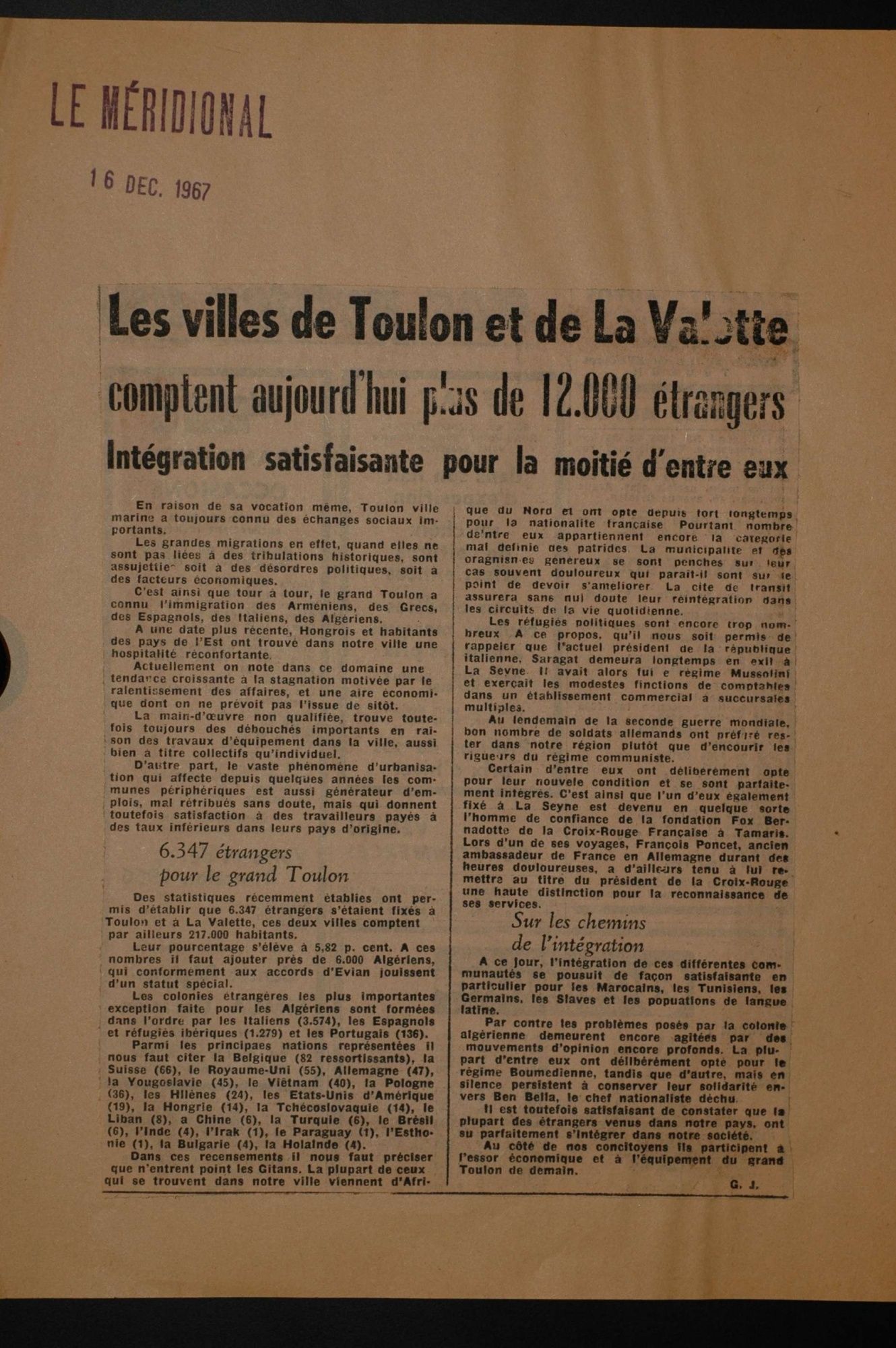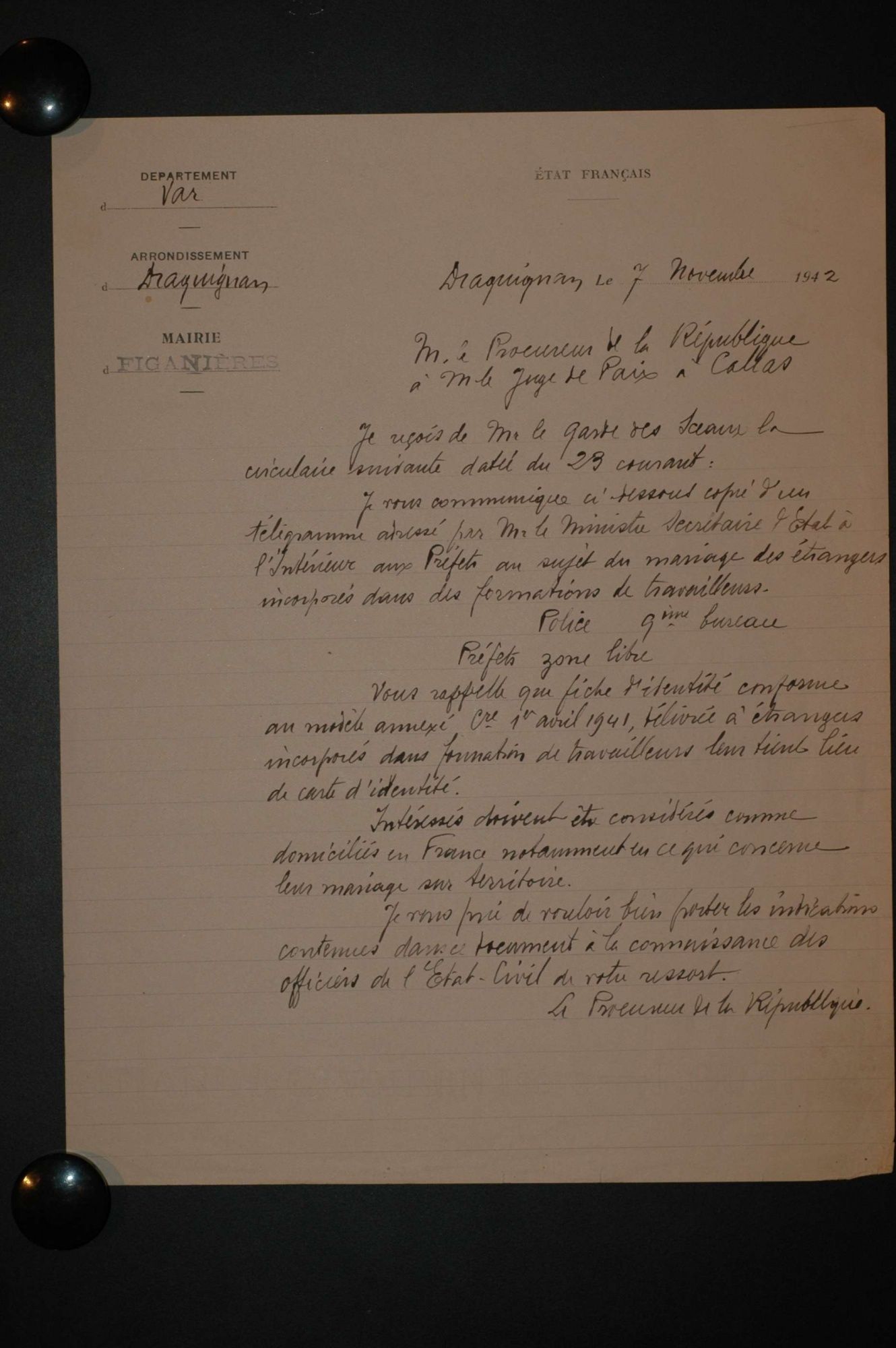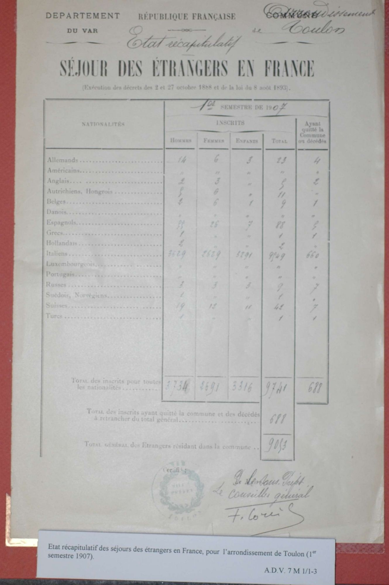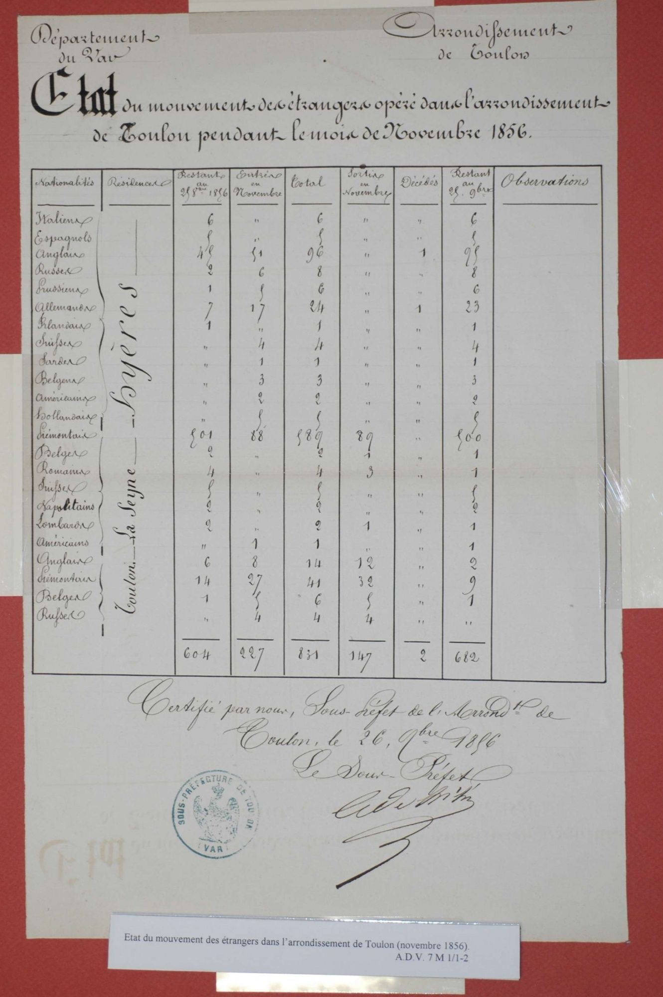 D'ici et d'ailleurs: immigration dans le Var ( XIXe - XXe siècles) D'ici et d'ailleurs: immigration dans le Var ( XIXe - XXe siècles) - Demande de naturalisation (1931) 1 D'ici et d'ailleurs: immigration dans le Var ( XIXe - XXe siècles) - Minute d'un rapport préfectoral au ministère de l'intérieur (1912) 1 D'ici et d'ailleurs: immigration dans le Var ( XIXe - XXe siècles) - Vie associative La Seyne sur Mer (1912) 1 D'ici et d'ailleurs: immigration dans le Var ( XIXe - XXe siècles) - Circulaire préfectorale (1926) 1 D'ici et d'ailleurs: immigration dans le Var ( XIXe - XXe siècles) - La Seyne sur Mer (1881) : Etat des entreprises publiques ou privées employant des ouvriers étrangers 1 D'ici et d'ailleurs: immigration dans le Var ( XIXe - XXe siècles) - Etat nominatif des réfugiés politiques (1938) 1 D'ici et d'ailleurs: immigration dans le Var ( XIXe - XXe siècles) - Procès-verbal de la séance ordinaire de la Chambre consultative d'agriculture (1858) 1 D'ici et d'ailleurs: immigration dans le Var ( XIXe - XXe siècles) - Etat des étrangers occupés dans l'agriculture au 1er décembre 1926 1 D'ici et d'ailleurs: immigration dans le Var ( XIXe - XXe siècles) - Récépissés de demande ou de renouvellement de carte d'identité (1941-1945) 1 D'ici et d'ailleurs: immigration dans le Var ( XIXe - XXe siècles) - Etat récapitulatif des séjours des étrangers , arrondissement de Toulon (1er semestre 1907) 1 D'ici et d'ailleurs: immigration dans le Var ( XIXe - XXe siècles) - Mouvement des étrangers dans l'arrondissement de Toulon (novembre 1856) 1 D'ici et d'ailleurs: immigration dans le Var ( XIXe - XXe siècles) - Etat des étrangers domiciliés sur la commune de Draguignan, par nationalité. (1927) 1 D'ici et d'ailleurs: immigration dans le Var ( XIXe - XXe siècles) - Mouvement des étrangers dans le département du Var pendant le mois de janvier 1833. 1 D'ici et d'ailleurs: immigration dans le Var ( XIXe - XXe siècles) - Recensement des étrangers en résidence à Draguignan en décembre 1927 (1928) 1 D'ici et d'ailleurs: immigration dans le Var ( XIXe - XXe siècles) - Rapport sur la colonie musulmane de la région de Toulon (1961) 1 D'ici et d'ailleurs: immigration dans le Var ( XIXe - XXe siècles) - Rapport sur les Nord-Africains (Algériens) dans le secteur de Toulon (1954). 1 D'ici et d'ailleurs: immigration dans le Var ( XIXe - XXe siècles) - Article relatif aux travailleurs étrangers, nord-africains et italiens ( Le méridional, 17 mars 1971) 1 D'ici et d'ailleurs: immigration dans le Var ( XIXe - XXe siècles) - Circulaire relative à l'attribution d'un prénom arabe aux enfants nés en France et issus de musulmans (1943) 1 D'ici et d'ailleurs: immigration dans le Var ( XIXe - XXe siècles) - Lettre du procureur de la République au juge de paix de Callas relative au mariage des étrangers (1942) 1 D'ici et d'ailleurs: immigration dans le Var ( XIXe - XXe siècles) - Circulaire du ministère du travail relative au mariage entre indochinois et femmes françaises (1943) 1 D'ici et d'ailleurs: immigration dans le Var ( XIXe - XXe siècles) - Fiche individuelle de dénombrement des étrangers sans nationalité et des étrangers bénéficiaires du droit d'asile 1 D'ici et d'ailleurs: immigration dans le Var ( XIXe - XXe siècles) - Récépissé de demande de carte d'invalidité de travailleur agricole 1 D'ici et d'ailleurs: immigration dans le Var ( XIXe - XXe siècles) - Article relatif aux étrangers à Brignoles (Le Méridional, 14 avril 1970) 1 D'ici et d'ailleurs: immigration dans le Var ( XIXe - XXe siècles) - Article relatif aux étrangers à Toulon (Le Méridional, 12 juin 1969) 1 D'ici et d'ailleurs: immigration dans le Var ( XIXe - XXe siècles) - Article relatif aux étrangers à Toulon (Le Méridional, 11 juin 1969) 1 D'ici et d'ailleurs: immigration dans le Var ( XIXe - XXe siècles) - Article relatif aux étrangers à Toulon et à La Valette (Le Méridional, 16 décembre 1967) 1 D'ici et d'ailleurs: immigration dans le Var ( XIXe - XXe siècles) - Plaquette éditée par la Préfecture du Var "Les immigrés dans le département du Var" (1978) 1 D'ici et d'ailleurs: immigration dans le Var ( XIXe - XXe siècles) - Registre des visas accordés par la commune de Barjols (1930-1934) 1 D'ici et d'ailleurs: immigration dans le Var ( XIXe - XXe siècles) - Affiche de l'exposition (2010) 1 D'ici et d'ailleurs: immigration dans le Var ( XIXe - XXe siècles) - Ouvrages présentés lors de l'exposition (2010) 1