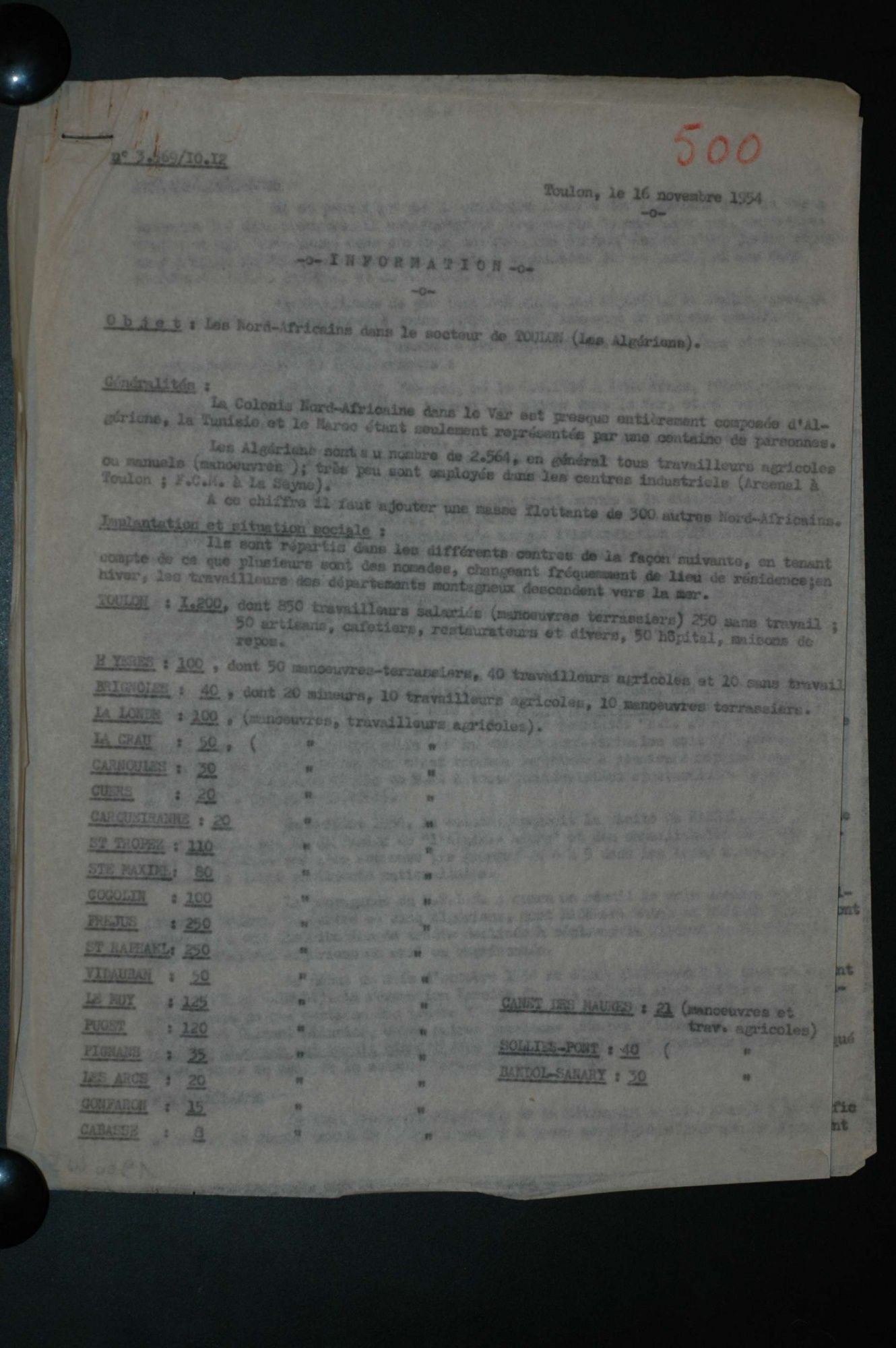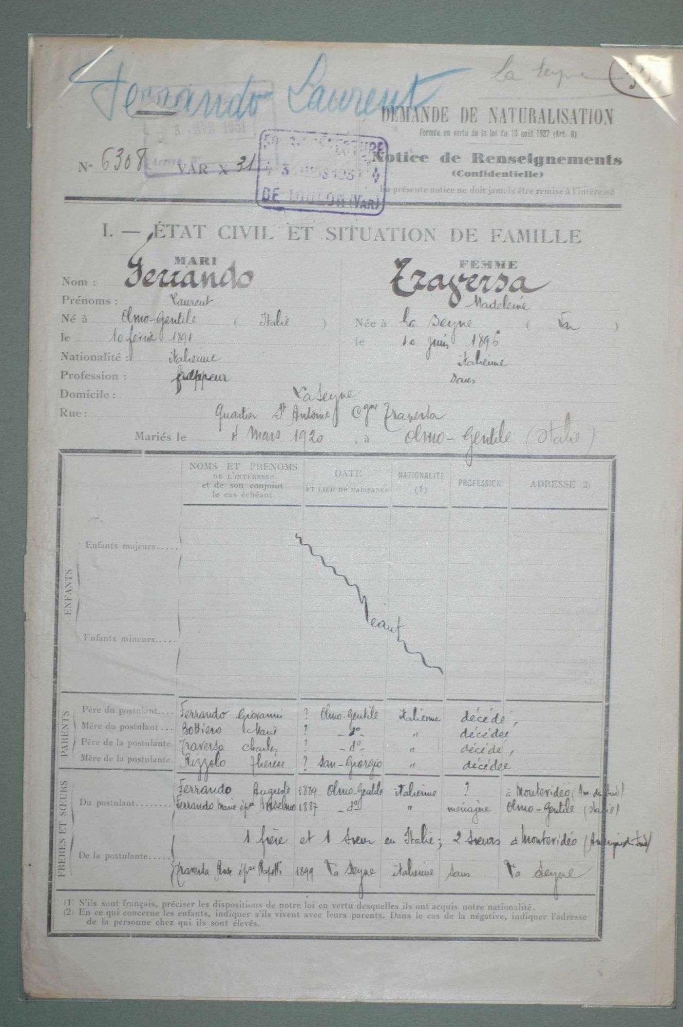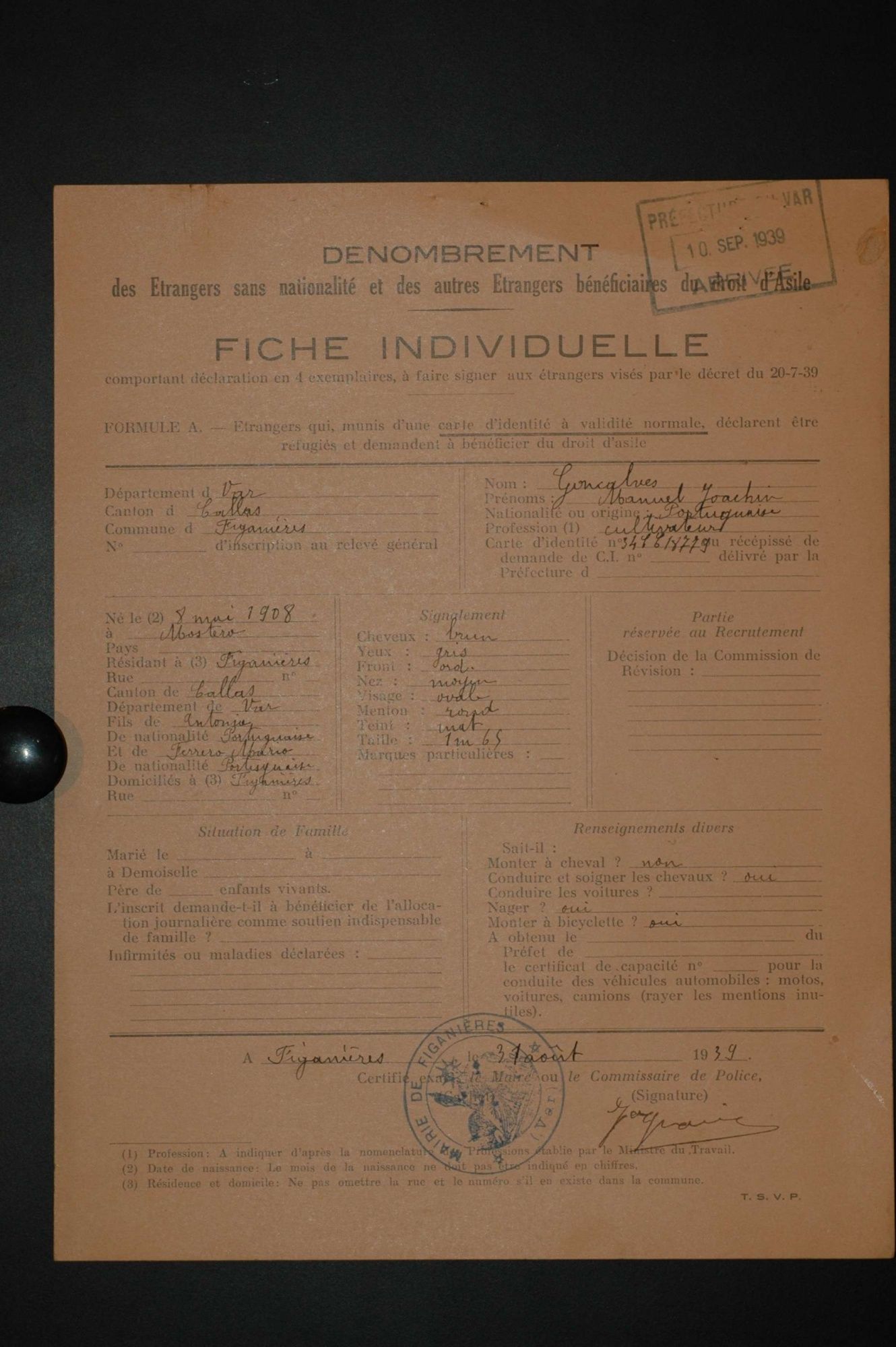 D'ici et d'ailleurs: immigration dans le Var ( XIXe - XXe siècles) D'ici et d'ailleurs: immigration dans le Var ( XIXe - XXe siècles) - Demande de naturalisation (1931) 1 D'ici et d'ailleurs: immigration dans le Var ( XIXe - XXe siècles) - Minute d'un rapport préfectoral au ministère de l'intérieur (1912) 1 D'ici et d'ailleurs: immigration dans le Var ( XIXe - XXe siècles) - Vie associative La Seyne sur Mer (1912) 1 D'ici et d'ailleurs: immigration dans le Var ( XIXe - XXe siècles) - Circulaire préfectorale (1926) 1 D'ici et d'ailleurs: immigration dans le Var ( XIXe - XXe siècles) - La Seyne sur Mer (1881) : Etat des entreprises publiques ou privées employant des ouvriers étrangers 1 D'ici et d'ailleurs: immigration dans le Var ( XIXe - XXe siècles) - Etat nominatif des réfugiés politiques (1938) 1 D'ici et d'ailleurs: immigration dans le Var ( XIXe - XXe siècles) - Procès-verbal de la séance ordinaire de la Chambre consultative d'agriculture (1858) 1 D'ici et d'ailleurs: immigration dans le Var ( XIXe - XXe siècles) - Etat des étrangers occupés dans l'agriculture au 1er décembre 1926 1 D'ici et d'ailleurs: immigration dans le Var ( XIXe - XXe siècles) - Récépissés de demande ou de renouvellement de carte d'identité (1941-1945) 1 D'ici et d'ailleurs: immigration dans le Var ( XIXe - XXe siècles) - Etat récapitulatif des séjours des étrangers , arrondissement de Toulon (1er semestre 1907) 1 D'ici et d'ailleurs: immigration dans le Var ( XIXe - XXe siècles) - Mouvement des étrangers dans l'arrondissement de Toulon (novembre 1856) 1 D'ici et d'ailleurs: immigration dans le Var ( XIXe - XXe siècles) - Etat des étrangers domiciliés sur la commune de Draguignan, par nationalité. (1927) 1 D'ici et d'ailleurs: immigration dans le Var ( XIXe - XXe siècles) - Mouvement des étrangers dans le département du Var pendant le mois de janvier 1833. 1 D'ici et d'ailleurs: immigration dans le Var ( XIXe - XXe siècles) - Recensement des étrangers en résidence à Draguignan en décembre 1927 (1928) 1 D'ici et d'ailleurs: immigration dans le Var ( XIXe - XXe siècles) - Rapport sur la colonie musulmane de la région de Toulon (1961) 1 D'ici et d'ailleurs: immigration dans le Var ( XIXe - XXe siècles) - Rapport sur les Nord-Africains (Algériens) dans le secteur de Toulon (1954). 1 D'ici et d'ailleurs: immigration dans le Var ( XIXe - XXe siècles) - Article relatif aux travailleurs étrangers, nord-africains et italiens ( Le méridional, 17 mars 1971) 1 D'ici et d'ailleurs: immigration dans le Var ( XIXe - XXe siècles) - Circulaire relative à l'attribution d'un prénom arabe aux enfants nés en France et issus de musulmans (1943) 1 D'ici et d'ailleurs: immigration dans le Var ( XIXe - XXe siècles) - Lettre du procureur de la République au juge de paix de Callas relative au mariage des étrangers (1942) 1 D'ici et d'ailleurs: immigration dans le Var ( XIXe - XXe siècles) - Circulaire du ministère du travail relative au mariage entre indochinois et femmes françaises (1943) 1 D'ici et d'ailleurs: immigration dans le Var ( XIXe - XXe siècles) - Fiche individuelle de dénombrement des étrangers sans nationalité et des étrangers bénéficiaires du droit d'asile 1 D'ici et d'ailleurs: immigration dans le Var ( XIXe - XXe siècles) - Récépissé de demande de carte d'invalidité de travailleur agricole 1 D'ici et d'ailleurs: immigration dans le Var ( XIXe - XXe siècles) - Article relatif aux étrangers à Brignoles (Le Méridional, 14 avril 1970) 1 D'ici et d'ailleurs: immigration dans le Var ( XIXe - XXe siècles) - Article relatif aux étrangers à Toulon (Le Méridional, 12 juin 1969) 1 D'ici et d'ailleurs: immigration dans le Var ( XIXe - XXe siècles) - Article relatif aux étrangers à Toulon (Le Méridional, 11 juin 1969) 1 D'ici et d'ailleurs: immigration dans le Var ( XIXe - XXe siècles) - Article relatif aux étrangers à Toulon et à La Valette (Le Méridional, 16 décembre 1967) 1 D'ici et d'ailleurs: immigration dans le Var ( XIXe - XXe siècles) - Plaquette éditée par la Préfecture du Var "Les immigrés dans le département du Var" (1978) 1 D'ici et d'ailleurs: immigration dans le Var ( XIXe - XXe siècles) - Registre des visas accordés par la commune de Barjols (1930-1934) 1 D'ici et d'ailleurs: immigration dans le Var ( XIXe - XXe siècles) - Affiche de l'exposition (2010) 1 D'ici et d'ailleurs: immigration dans le Var ( XIXe - XXe siècles) - Ouvrages présentés lors de l'exposition (2010) 1