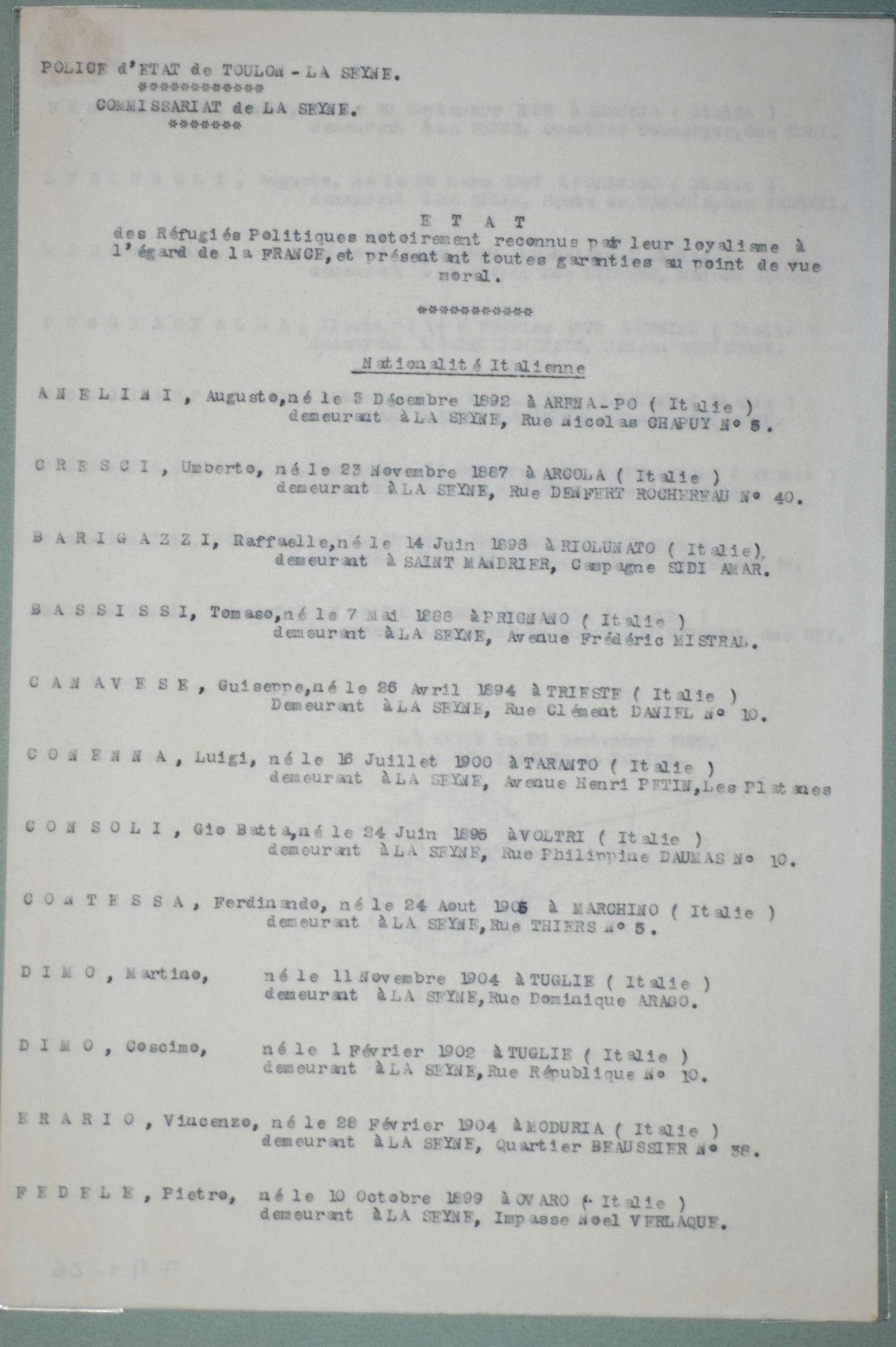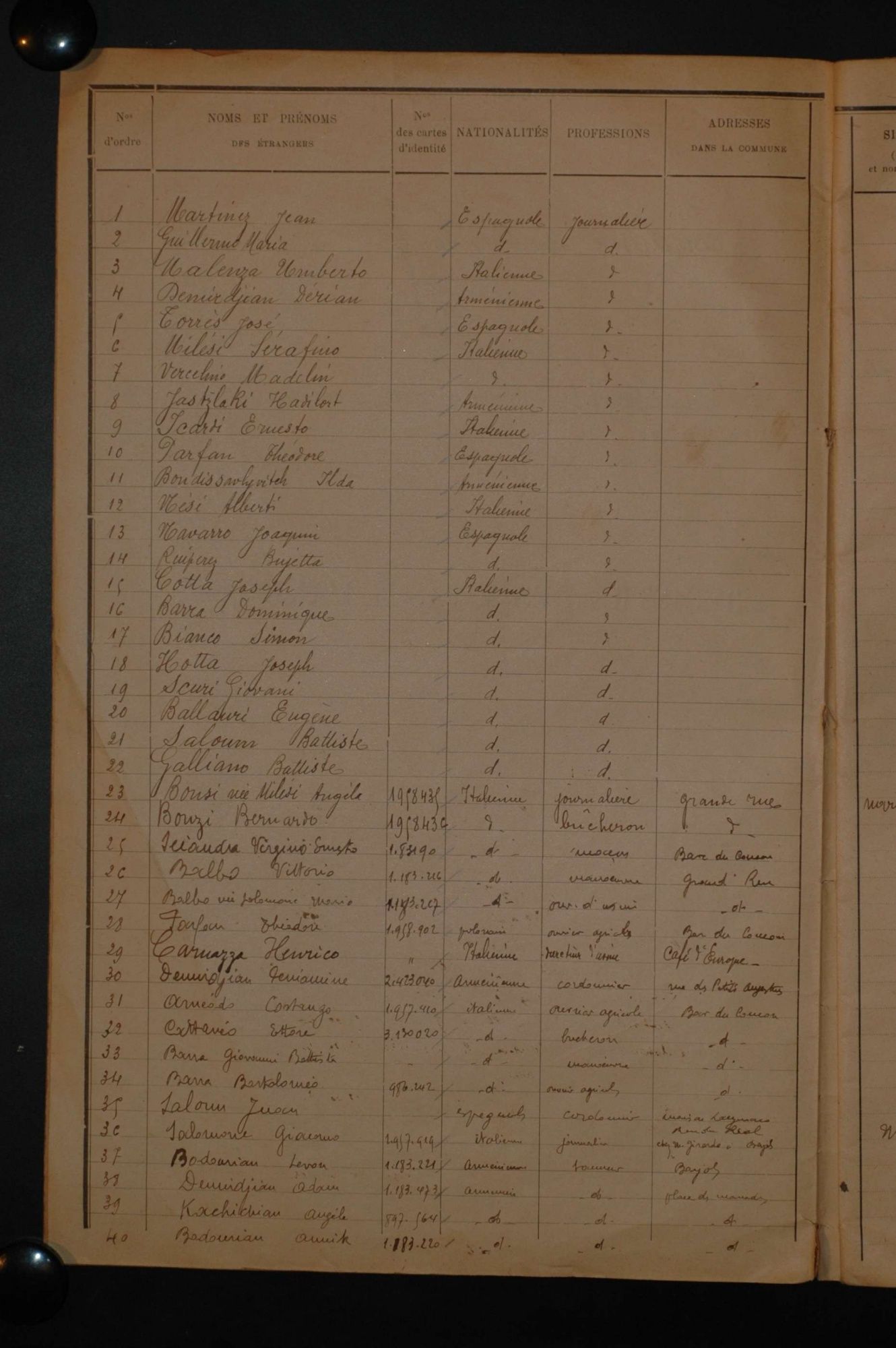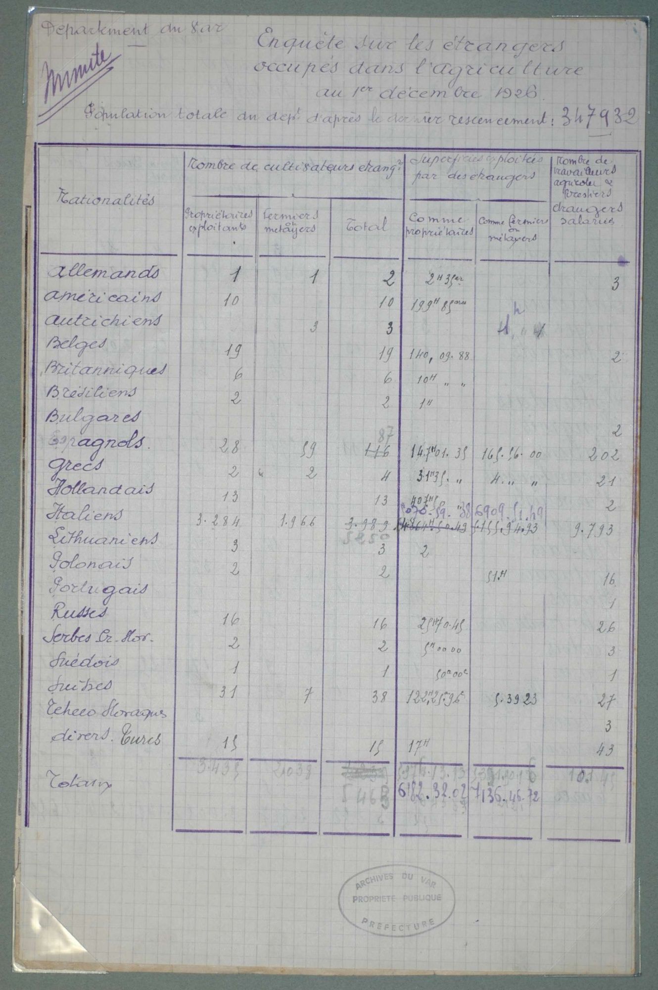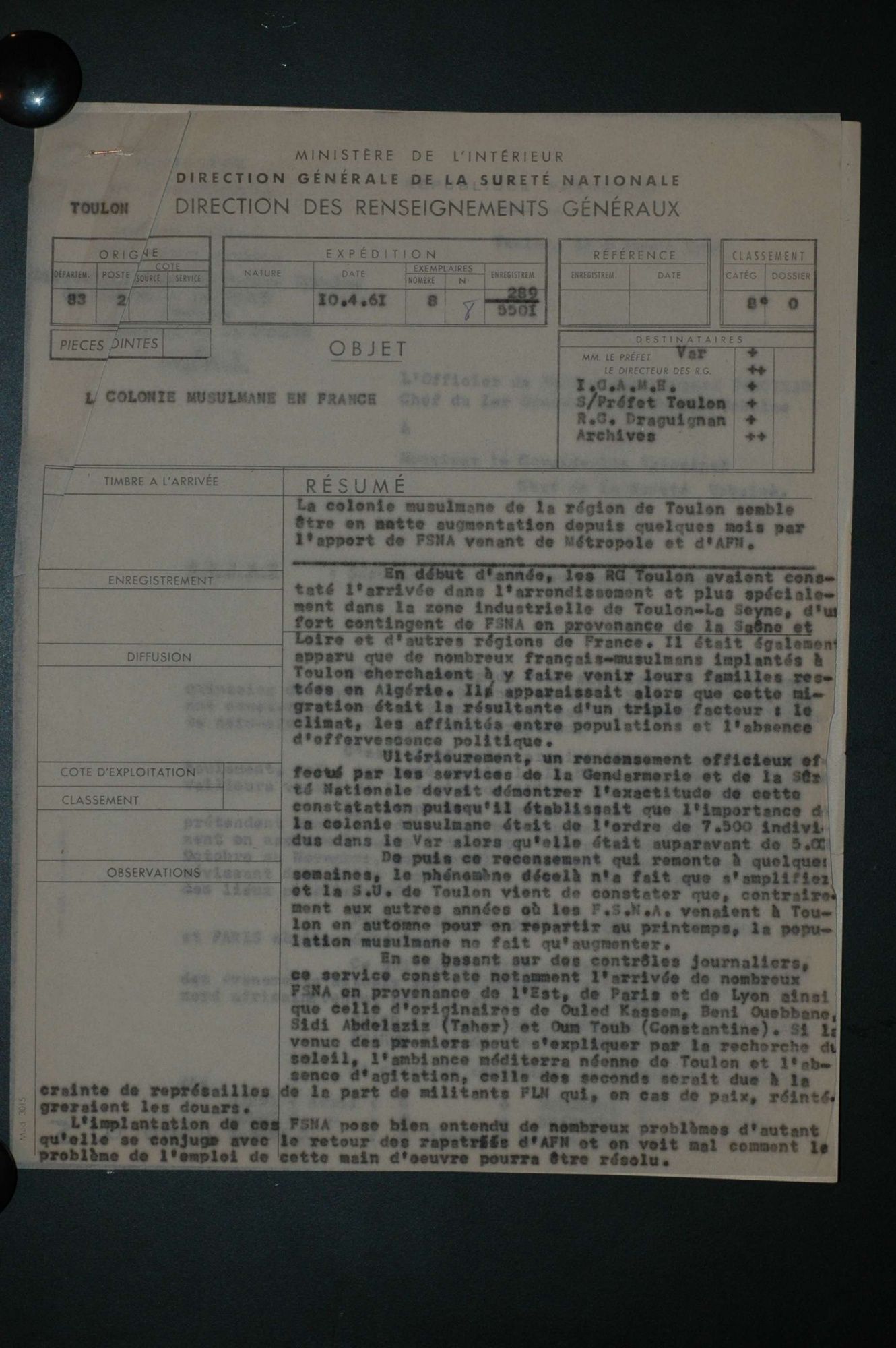 D'ici et d'ailleurs: immigration dans le Var ( XIXe - XXe siècles) D'ici et d'ailleurs: immigration dans le Var ( XIXe - XXe siècles) - Demande de naturalisation (1931) 1 D'ici et d'ailleurs: immigration dans le Var ( XIXe - XXe siècles) - Minute d'un rapport préfectoral au ministère de l'intérieur (1912) 1 D'ici et d'ailleurs: immigration dans le Var ( XIXe - XXe siècles) - Vie associative La Seyne sur Mer (1912) 1 D'ici et d'ailleurs: immigration dans le Var ( XIXe - XXe siècles) - Circulaire préfectorale (1926) 1 D'ici et d'ailleurs: immigration dans le Var ( XIXe - XXe siècles) - La Seyne sur Mer (1881) : Etat des entreprises publiques ou privées employant des ouvriers étrangers 1 D'ici et d'ailleurs: immigration dans le Var ( XIXe - XXe siècles) - Etat nominatif des réfugiés politiques (1938) 1 D'ici et d'ailleurs: immigration dans le Var ( XIXe - XXe siècles) - Procès-verbal de la séance ordinaire de la Chambre consultative d'agriculture (1858) 1 D'ici et d'ailleurs: immigration dans le Var ( XIXe - XXe siècles) - Etat des étrangers occupés dans l'agriculture au 1er décembre 1926 1 D'ici et d'ailleurs: immigration dans le Var ( XIXe - XXe siècles) - Récépissés de demande ou de renouvellement de carte d'identité (1941-1945) 1 D'ici et d'ailleurs: immigration dans le Var ( XIXe - XXe siècles) - Etat récapitulatif des séjours des étrangers , arrondissement de Toulon (1er semestre 1907) 1 D'ici et d'ailleurs: immigration dans le Var ( XIXe - XXe siècles) - Mouvement des étrangers dans l'arrondissement de Toulon (novembre 1856) 1 D'ici et d'ailleurs: immigration dans le Var ( XIXe - XXe siècles) - Etat des étrangers domiciliés sur la commune de Draguignan, par nationalité. (1927) 1 D'ici et d'ailleurs: immigration dans le Var ( XIXe - XXe siècles) - Mouvement des étrangers dans le département du Var pendant le mois de janvier 1833. 1 D'ici et d'ailleurs: immigration dans le Var ( XIXe - XXe siècles) - Recensement des étrangers en résidence à Draguignan en décembre 1927 (1928) 1 D'ici et d'ailleurs: immigration dans le Var ( XIXe - XXe siècles) - Rapport sur la colonie musulmane de la région de Toulon (1961) 1 D'ici et d'ailleurs: immigration dans le Var ( XIXe - XXe siècles) - Rapport sur les Nord-Africains (Algériens) dans le secteur de Toulon (1954). 1 D'ici et d'ailleurs: immigration dans le Var ( XIXe - XXe siècles) - Article relatif aux travailleurs étrangers, nord-africains et italiens ( Le méridional, 17 mars 1971) 1 D'ici et d'ailleurs: immigration dans le Var ( XIXe - XXe siècles) - Circulaire relative à l'attribution d'un prénom arabe aux enfants nés en France et issus de musulmans (1943) 1 D'ici et d'ailleurs: immigration dans le Var ( XIXe - XXe siècles) - Lettre du procureur de la République au juge de paix de Callas relative au mariage des étrangers (1942) 1 D'ici et d'ailleurs: immigration dans le Var ( XIXe - XXe siècles) - Circulaire du ministère du travail relative au mariage entre indochinois et femmes françaises (1943) 1 D'ici et d'ailleurs: immigration dans le Var ( XIXe - XXe siècles) - Fiche individuelle de dénombrement des étrangers sans nationalité et des étrangers bénéficiaires du droit d'asile 1 D'ici et d'ailleurs: immigration dans le Var ( XIXe - XXe siècles) - Récépissé de demande de carte d'invalidité de travailleur agricole 1 D'ici et d'ailleurs: immigration dans le Var ( XIXe - XXe siècles) - Article relatif aux étrangers à Brignoles (Le Méridional, 14 avril 1970) 1 D'ici et d'ailleurs: immigration dans le Var ( XIXe - XXe siècles) - Article relatif aux étrangers à Toulon (Le Méridional, 12 juin 1969) 1 D'ici et d'ailleurs: immigration dans le Var ( XIXe - XXe siècles) - Article relatif aux étrangers à Toulon (Le Méridional, 11 juin 1969) 1 D'ici et d'ailleurs: immigration dans le Var ( XIXe - XXe siècles) - Article relatif aux étrangers à Toulon et à La Valette (Le Méridional, 16 décembre 1967) 1 D'ici et d'ailleurs: immigration dans le Var ( XIXe - XXe siècles) - Plaquette éditée par la Préfecture du Var "Les immigrés dans le département du Var" (1978) 1 D'ici et d'ailleurs: immigration dans le Var ( XIXe - XXe siècles) - Registre des visas accordés par la commune de Barjols (1930-1934) 1 D'ici et d'ailleurs: immigration dans le Var ( XIXe - XXe siècles) - Affiche de l'exposition (2010) 1 D'ici et d'ailleurs: immigration dans le Var ( XIXe - XXe siècles) - Ouvrages présentés lors de l'exposition (2010) 1