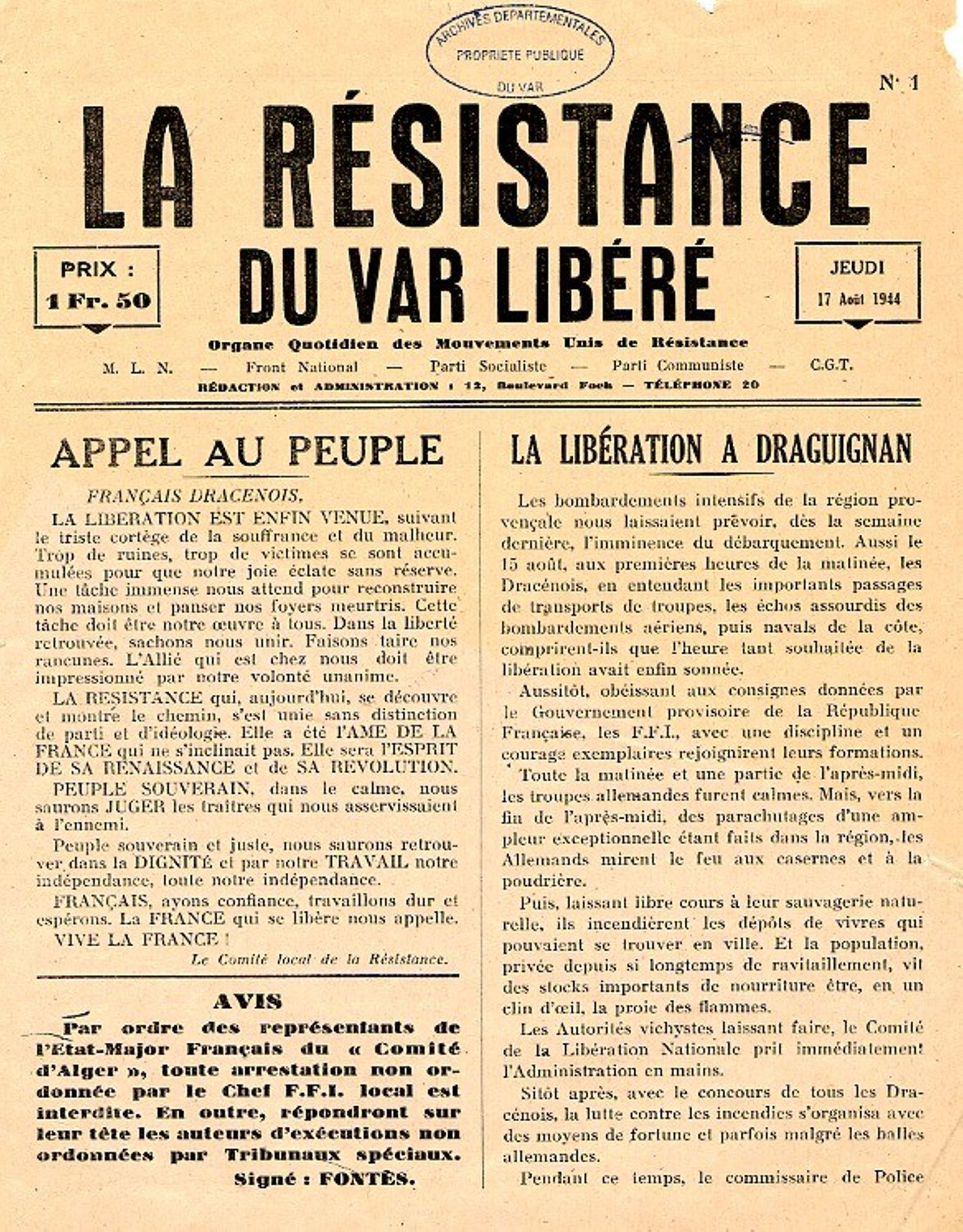 Trésors d'archives Cette exposition virtuelle présente aux internautes un florilège des documents les plus beaux et les plus représentatifs des Archives départementales du Var. Trésors d'archives - Lancement du bananier Djoliba aux chantiers navals de la Seyne-sur-mer (1947) 1 Trésors d'archives - Plan anglais du blocus de Toulon par les Anglo-Hollandais (1707) 1 Trésors d'archives - Portrait de Clémenceau avec sa signature [début 20e s.] 1 Trésors d'archives - Dessin de Pierre Letuaire, caricaturiste toulonnais (19e s.) 1 Trésors d'archives - Dessins de Pierre Letuaire, caricaturiste toulonnais (19e s.) 1 Trésors d'archives - Diplôme enluminé de docteur en Médecine attribué à Jean-Claude Laugier (1671) 1 Trésors d'archives - Image d'Epinal représentant Napoléon Bonaparte au siège de Toulon de 1793 [1810-1813] 1 Trésors d'archives - Photo publicitaire représentant l'Hôtel des Iles d'or à Hyères [début 20e s.] 1 Trésors d'archives - Affiche touristique de Saint-Raphaël (vers 1938) 1 Trésors d'archives - Affiche publicitaire du journal Toulon-soir (20e s.) 1 Trésors d'archives - Bulle pontificale d'Innocent II (1143) 1 Trésors d'archives - Vignette révolutionnaire 1 Trésors d'archives - Drapeau tricolore et billet saisis comme pièces à conviction (1817) 1 Trésors d'archives - Dragon figurant sur un feuillet d'un registre des délibérations communales de Draguignan (1552-1563) 1 Trésors d'archives - Portrait de Saint-Lazare 1 Trésors d'archives - Journal : La Résistance du Var libéré (17 août 1944) 1 Trésors d'archives - Plan "futuriste" du centre urbain de Draguignan (1933) 1 Trésors d'archives - Portrait de Jacques-Athanase Lombard-Taradeau, député du Tiers-Etat [fin 18e s.] 1 Trésors d'archives - Arrivée de l'escadre russe à Toulon (1893) 1 Trésors d'archives - Lettrine en couleur extraite d'un antiphonaire (15e s.) 1 Trésors d'archives - Feuillet d'un registre de minutes d'Anthoine Bonifay (1528) 1 Trésors d'archives - Seing manuel de Guillermo Régis, notaire apostolique et impérial (1467) 1 Trésors d'archives - Plan et projet de reconstruction d'une partie du pont de Vins sur la rivière de Caramy (1791) 1 Trésors d'archives - Modèles et dessins brevetés de boîtes en carton blanc servant à l'expédition des graines de vers à soie (1923) 1 Trésors d'archives - Plan des bois de la commanderie hospitalière d'Astros située sur la commune de Vidauban (1769) 1 Trésors d'archives - Planeurs et troupes américaines à La Motte (15 août 1944) 1
